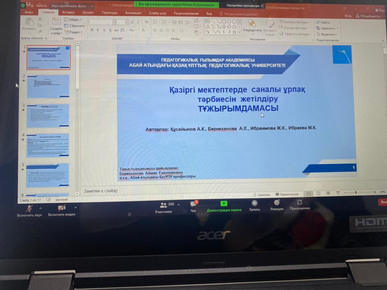 Алматы қаласы Білім басқармасының басшысы Л. А. Жылқыбаева мен п.ғ.д, академик Педагогикалық ғылымдар Академиясы басқарма төрағасы А. Қ.Құсайыновтың ұйымдастыруымен 2022 жылдың 29 қаңтарында Педагогикалық Ғылымдар Академиясының “Мектептерде саналы ұрпақ тәрбиелеудегі ғылыми-практикалық тұрғыдан іске асыру жолдары” жобасы бойынша онлайн семинар өтті. Аталған семинарға