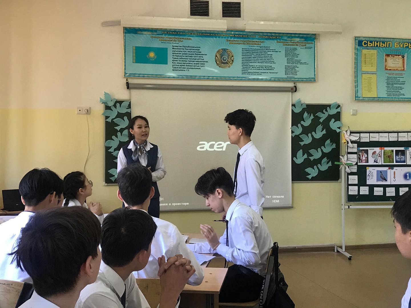 9 «Ә» сынып оқушылары “Қазақ тілі” пәнінен «Бейбітшілік- жаһандық даму кепілі» деген тақырыпта ашық сабақ өтті. Сабақта оқушылар «Ұйымға бірігу” әдісі арқылы топқа бөлініп, «Елші жіберу», « Ұшатын сұрақтар», «Көгершіннен хат», «Жарнама» секілді әдістер арқылы жаңа тақырыпты жақсы меңгеріп шықты. Сабақ соңында оқушылар көгершінге хат жолдау арқылы сабақтан алған әсерлерімен бөлісті.