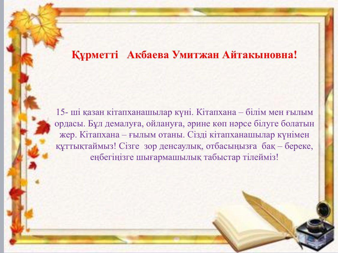 Біз өзіміздің мектеп-гимназиямыздағы кітапханашы Акбаева Үмітжан Айтақынқызын айтулы мерекесімен құттықтаймыз.