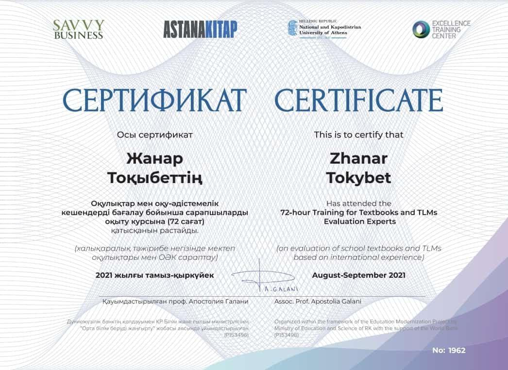 Оқулықтар мен оқу әдістемелік кешендерді бағалау бойынша сарапшы лауазымына ие болған мектебіміздің бастауыш сынып мұғалімі Тоқыбет Жанар Байұзаққызын айтулы жетістігімен құттықтаймыз.