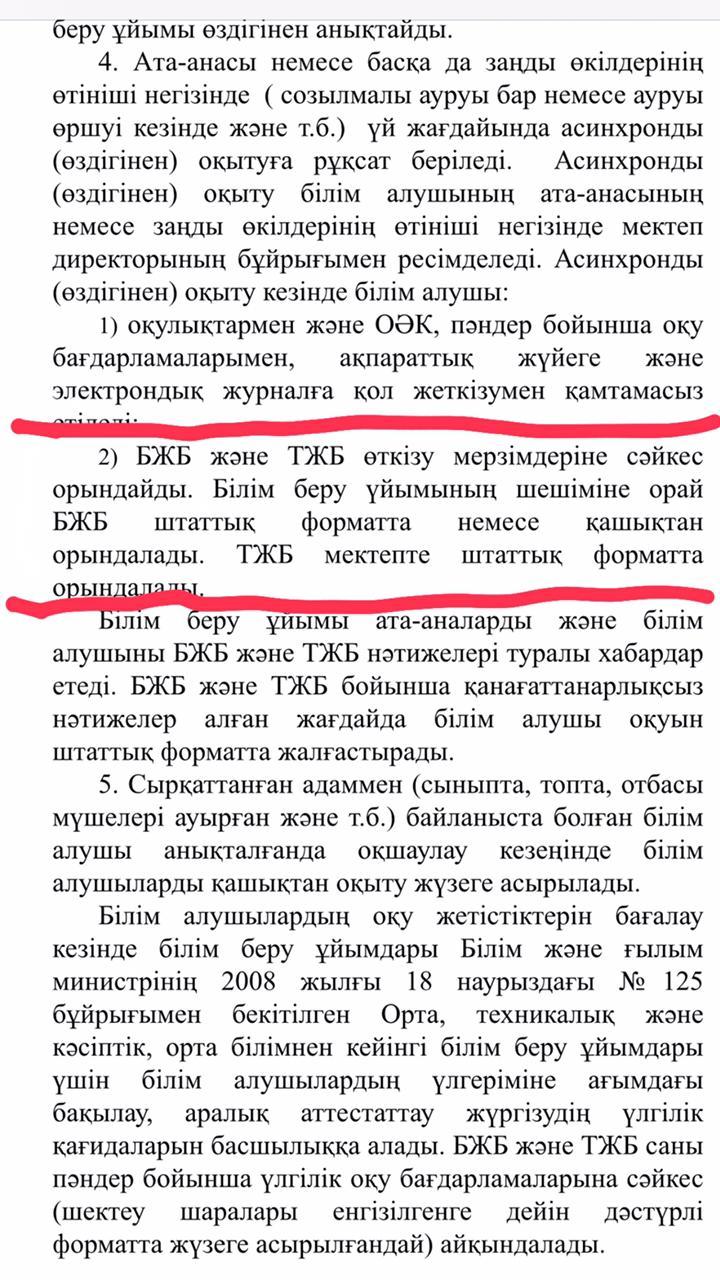 “БЖБ және ТЖБ өткізу мерзімдеріне сәйкес орындайды. Білім беру ұйымының шешіміне орай БЖБ штаттық форматта немесе қашықтан орындалады. ТЖБ мектепте штаттық форматта орындалады”- деп бекітілді.