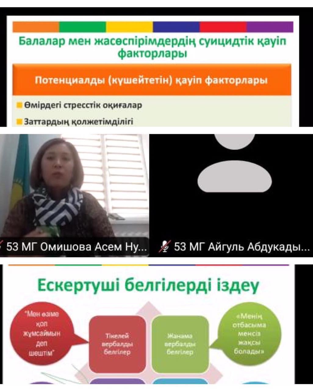 Вебинарда аутодеструктивті мінез- құлықтың алдын-алу вахтерлері ретінде хабардар болуын арттыру және жасөспірімдердің өз-өзіне қол жұмсау мінез-құлқының белгілерін тану мақсатында көптеген құнды мәліметтер айтылды.