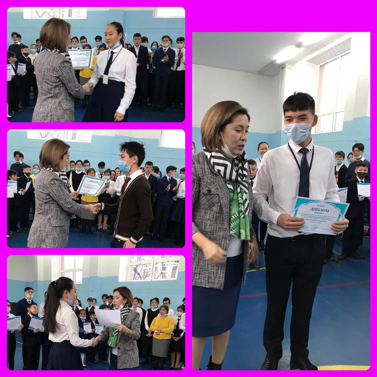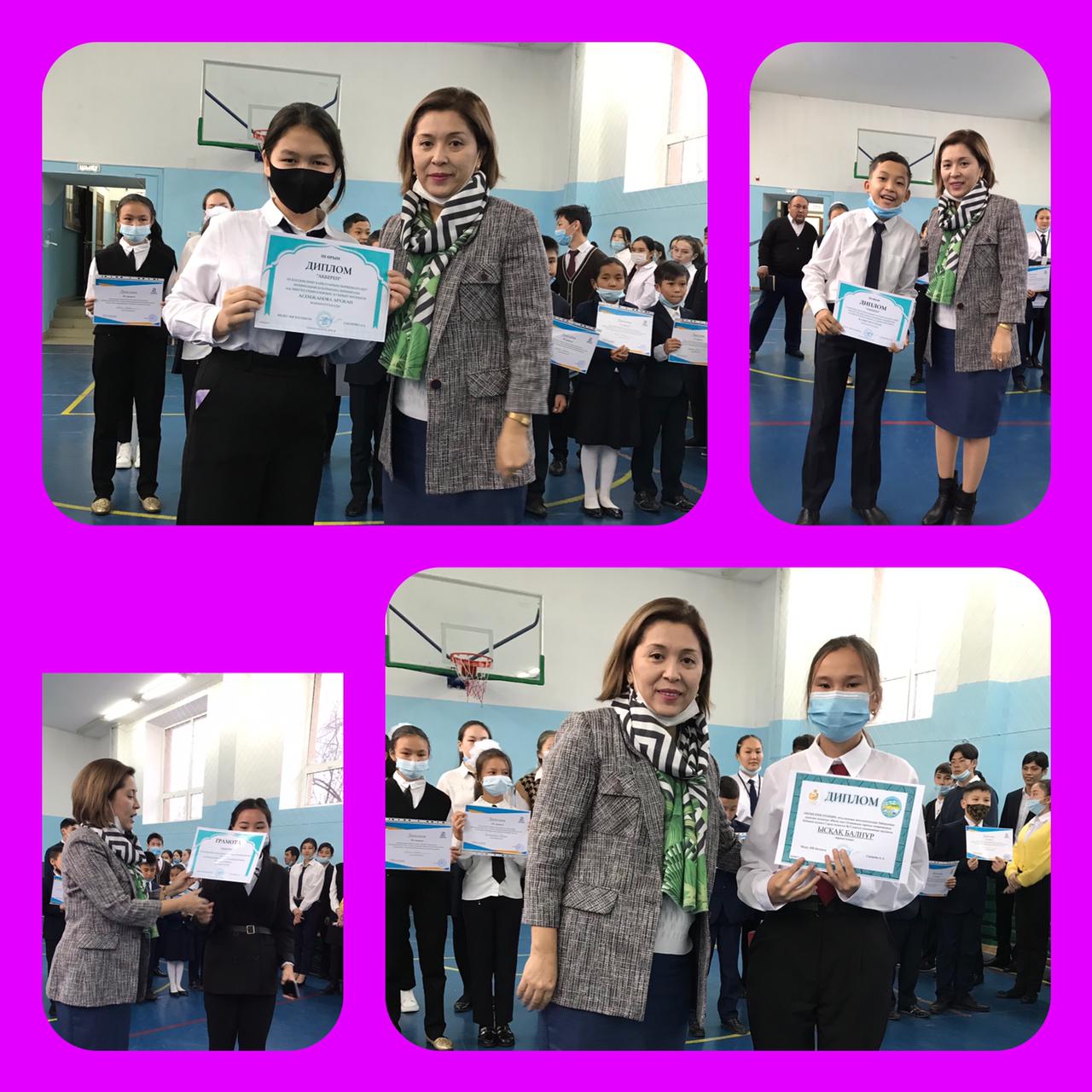 11 ноябрь 2021 0 1 2 3 4 5 Аудандық "Ақберен" байқауының жеңімпаздарын марапаттау. Аудандық “Ақберен” байқауынан 53 мектеп-гимназиясының оқушылары жүлделі I, II, III орындарға ие болды. Дарынды оқушыларды мектеп директоры Омишова А.Н құттықтап, грамоталарын табыстады.