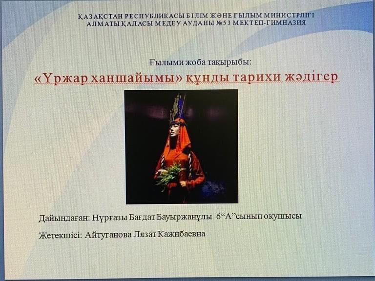 11.12.2021 жылы Алматы қаласында 5-7 сыныптар арасында “Зерде” ғылыми жоба байқауы өтті. Осы сайысқа “Ұржар ханшайымы” құнды тарихи жәдігер” зерттеу жұмысымен 6 “А” сынып оқушысы Нұрғазы Бағдат қатысып жүлделі 2 орын иегері атанды. Ғылыми жетекшісі: тарих пәні мұғалімі Айтуганова Лязат Кажибаевна