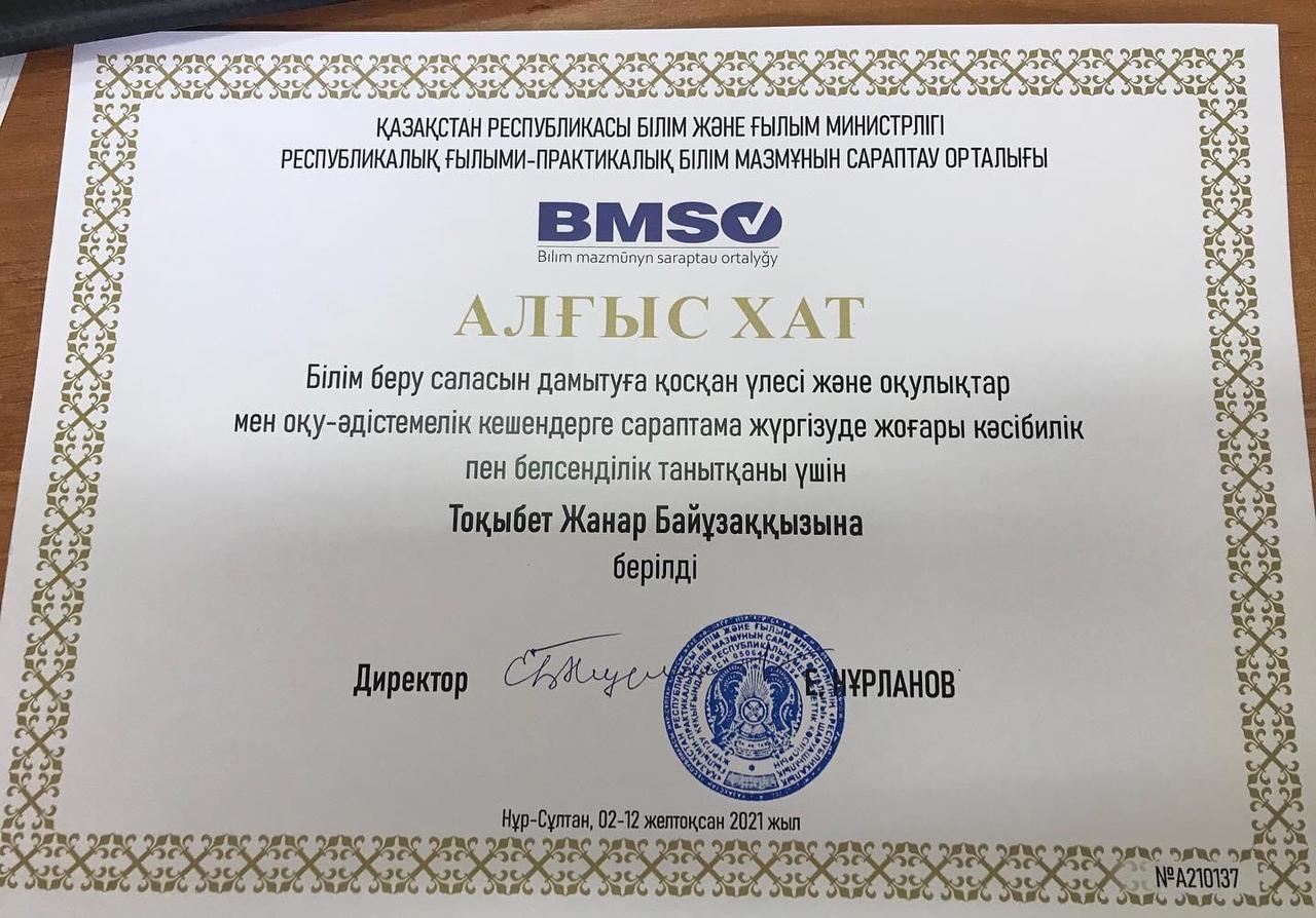 ҚР Білім және ғылым министрлігі республикалық ғылыми-практикалық білім мазмұнын сараптау орталығы білім беру саласын дамытуға қосқан үлесі және оқулықтар мен оқу-әдістемелік кешендерге сараптама жүргізуде жоғары кәсібилік пен белсенділік танытқаны үшін мектебіміздің бастауыш сынып мұғалімі Тоқыбет Жанар Байұзаққызы аталған орталықтың директоры Е. Нұрлановтың алғыс хатымен марапатталды.