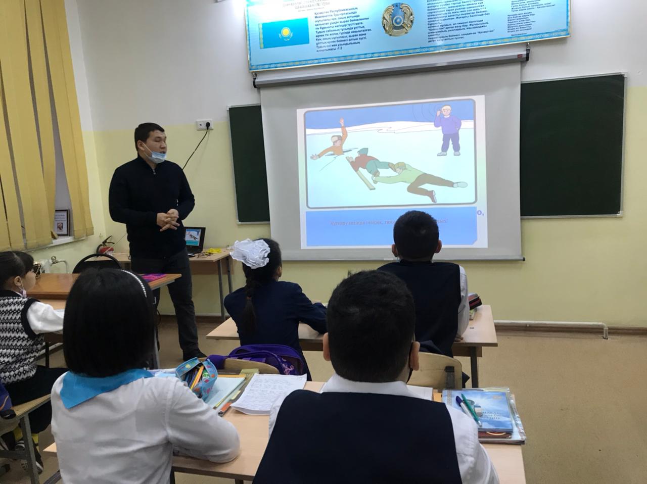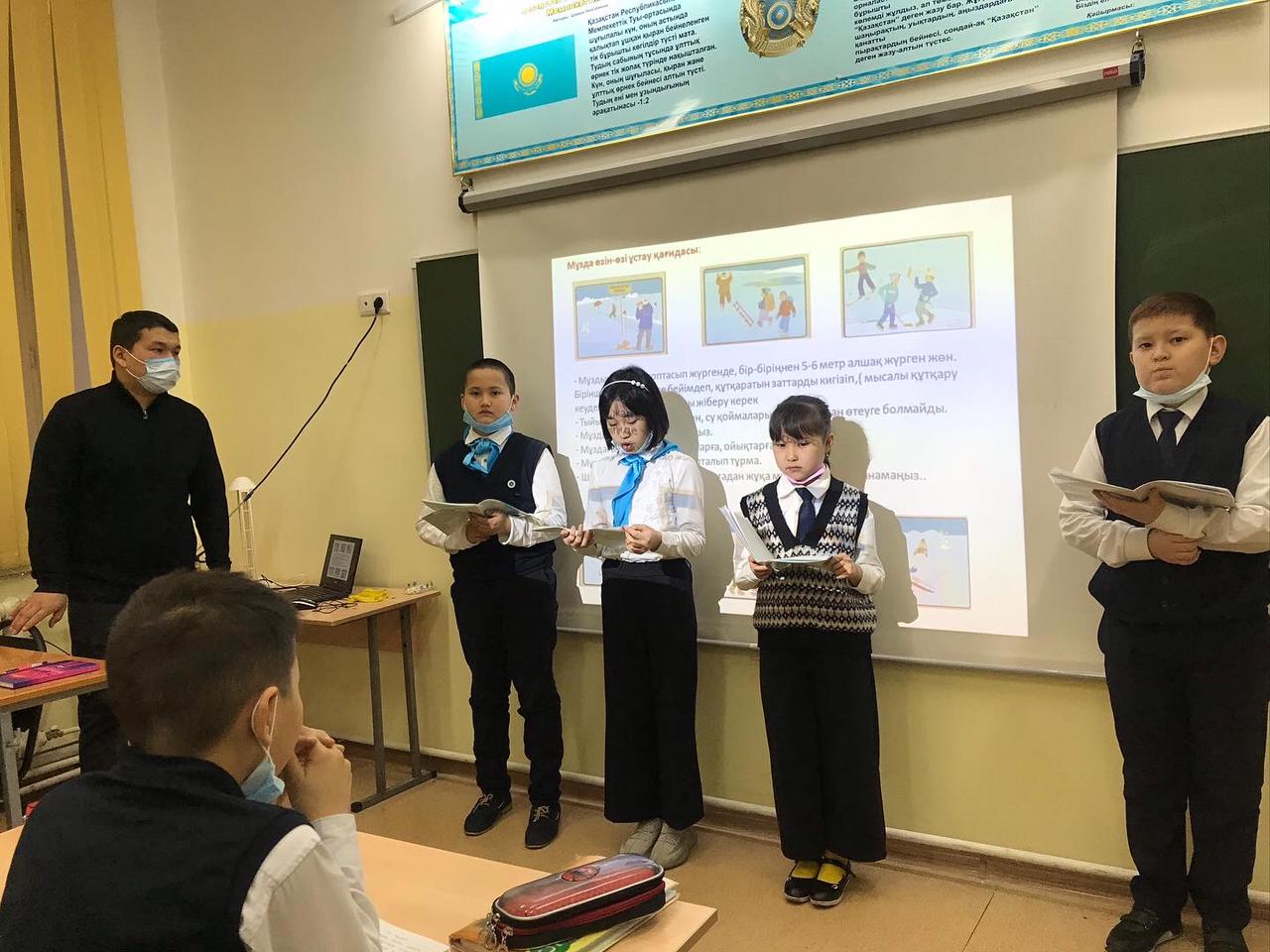 01.02.2022ж күні мектебімізде оқушылар “Қыс мезгіліндегі қауіпсіздік ережелері” тақырыбында сынып сағатын өтті. Сынып сағатында оқушыларға жұқа, қатпаған мұзда жүрмеу керектігі, тыйым салынған жерлерден ,сондай-ақ, су қоймаларындағы мұздан өтуге болмайтындығы сынды қарапайым ережелер түсіндіріліп, видеороликтер көрсетіліп және ең маңыздысы- қыс мезгілінде жолда жүру ережелерін қатаң сақтау керектігі туралы айтылды.