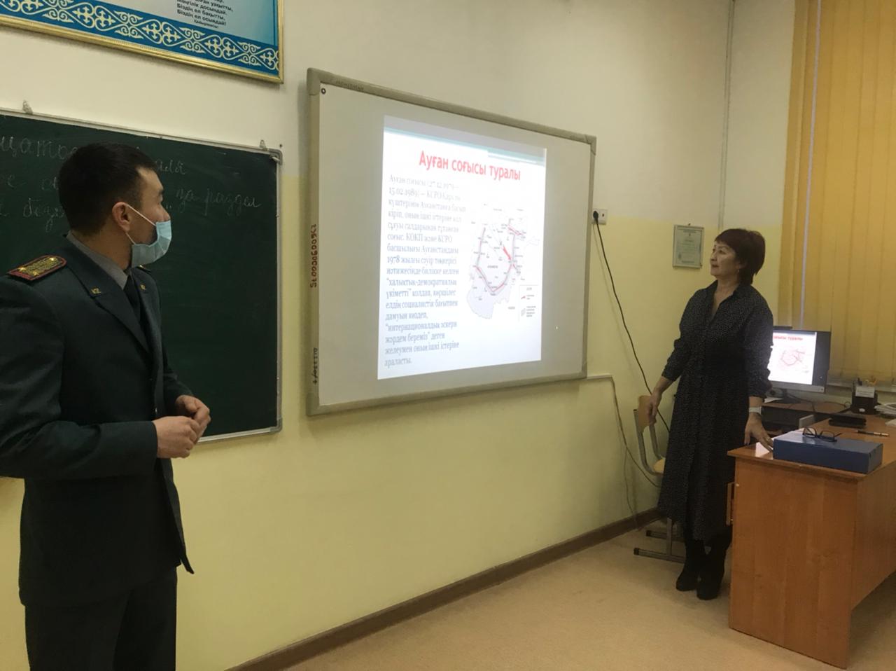 Бүгін 9-11 сынып оқушылары «Ауған қасіреті» тақырыбында тәрбие сағатын өтті. Оқушылар "Ауған соғысы" жайлы тереңірек біліп тану және оған қатысқан соғыс ардегерлері туралы мәлімет алу мақсатында өтілген бұл тәрбие сағатының тәрбиелік мәні- Тәуелсіздік жолында күрескен аға- апаларымыздың ерлігін кейінгі ұрпаққа үлгі ету болды.