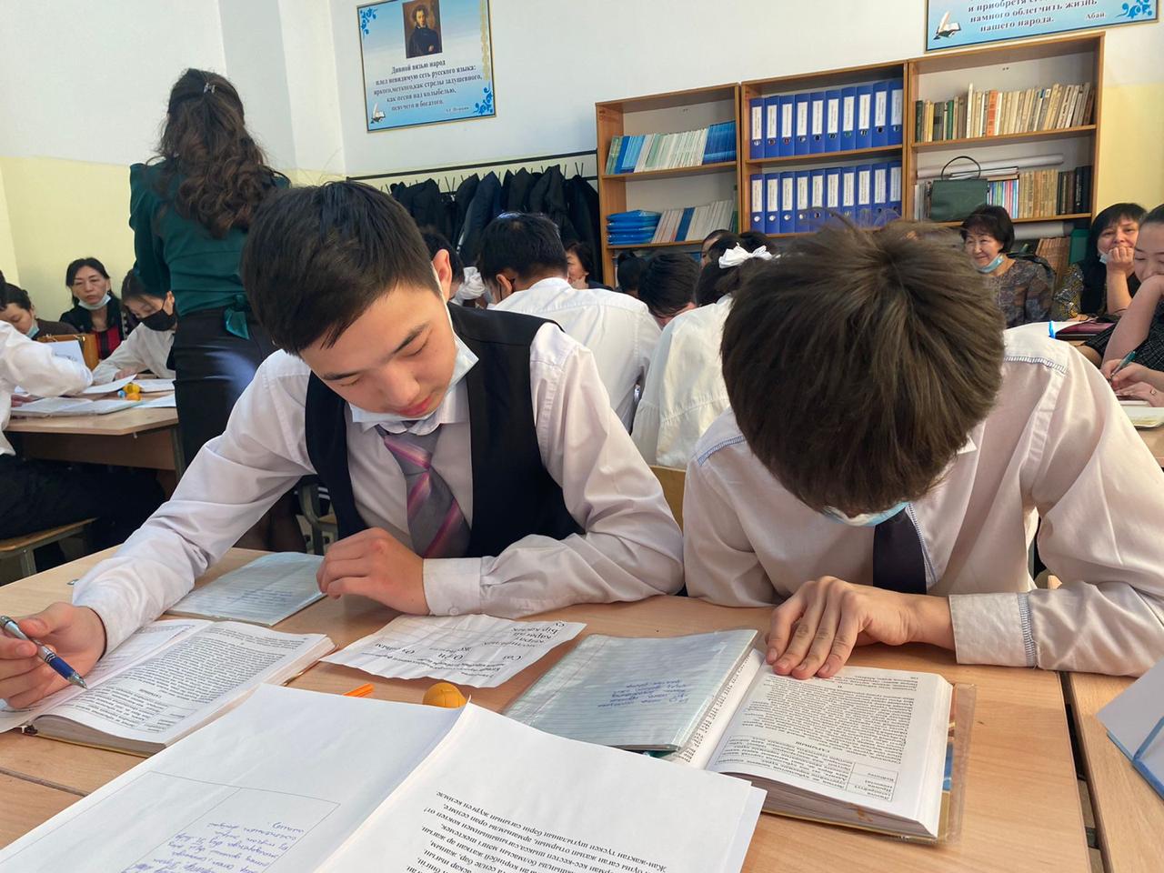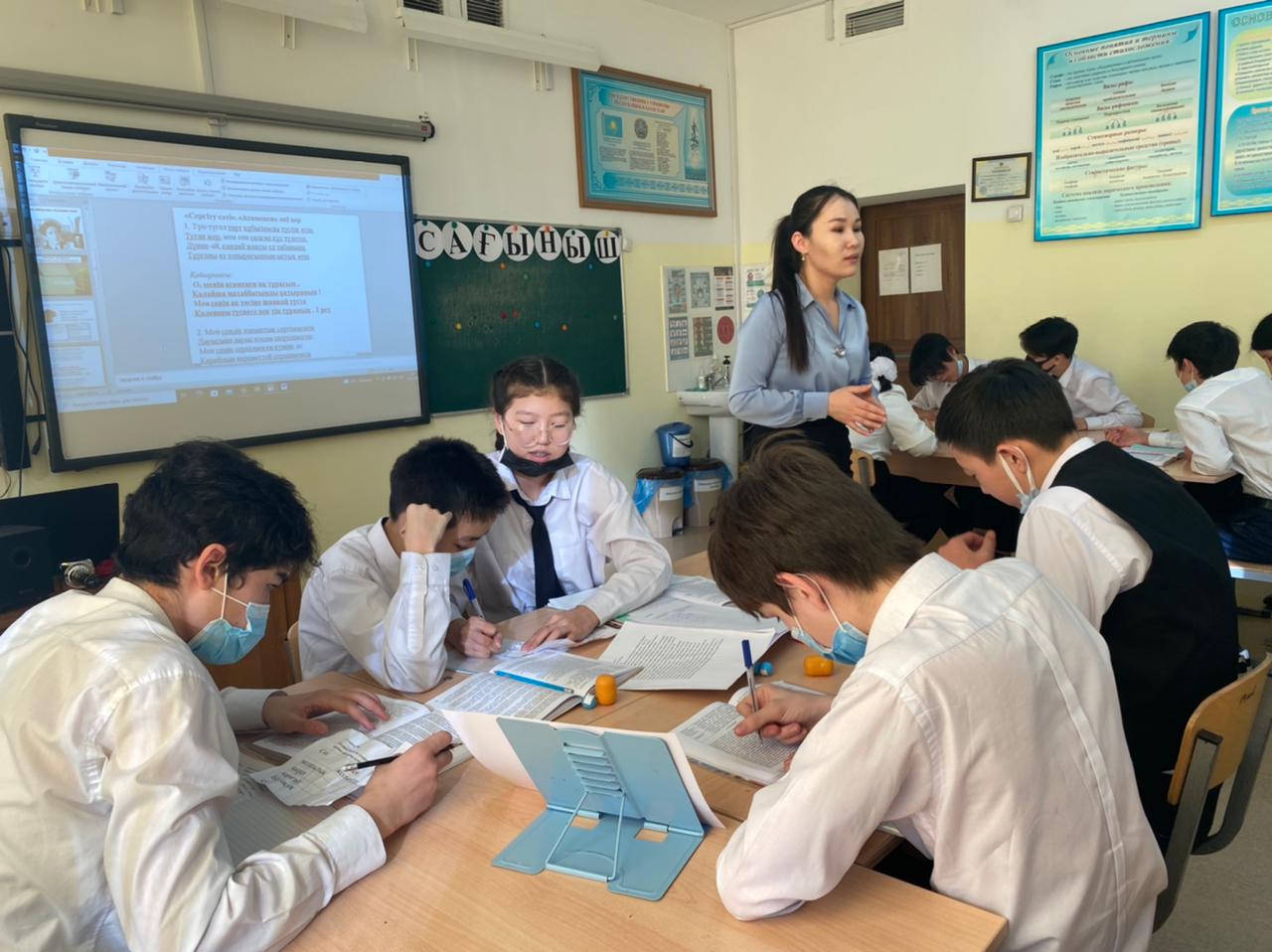 9 «Ә» сынып оқушылары қазақ әдебиеті пәнінен “Төлеген Айбергеновтің “Сағыныш” өлеңі” тақырыбында ашық сабақ өтті. Сәулелі жұлдыздай жарқ етіп жоқ болған біртуар ақынның қаламынан туған отты жырлардың оқырман жүрегінен мәңгі орын алатындығын, оның мағынасы мен құрылымының басқа ақындардан ерекшелігінің өзі ақынның қайталанбас тұлға екендігінің айғағы болатындығын әр оқушы осы сабақта жақсы түсінді. Сабақта “Бинго”, “Сырлы сөз”, “ Су құбыры”, т.б секілді әдістер қолданылып, оқушылар сабаққа белсенді қатысты. Сабақ барысында Оқушылар ақынға еліктей отырып, сағыныш сезімі жайлы өлең де шығарды.