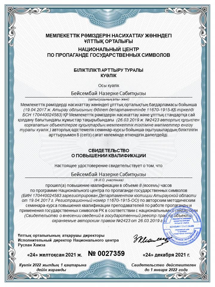 Мемлекеттік Рәміздерді насихаттау жөніндегі ұлттық орталығы. Біліктілікті арттыру туралы куәлік.