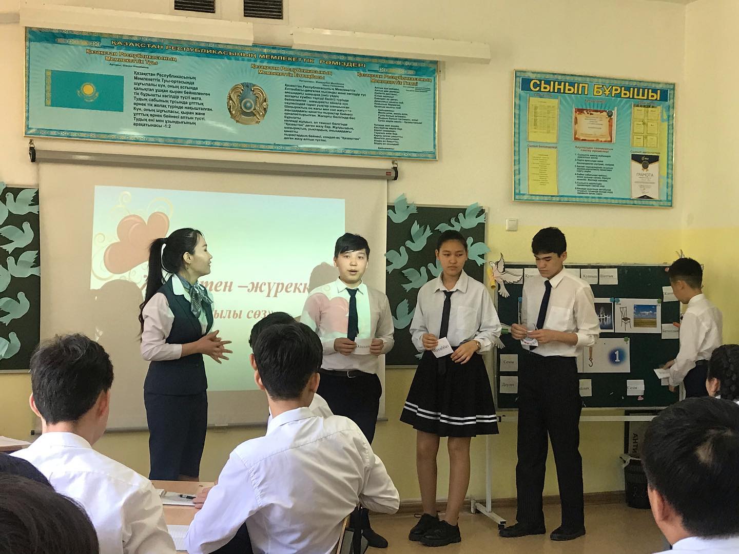 9 «Ә» сынып оқушылары “Қазақ тілі” пәнінен «Бейбітшілік- жаһандық даму кепілі» деген тақырыпта ашық сабақ өтті. Сабақта оқушылар «Ұйымға бірігу” әдісі арқылы топқа бөлініп, «Елші жіберу», « Ұшатын сұрақтар», «Көгершіннен хат», «Жарнама» секілді әдістер арқылы жаңа тақырыпты жақсы меңгеріп шықты. Сабақ соңында оқушылар көгершінге хат жолдау арқылы сабақтан алған әсерлерімен бөлісті.