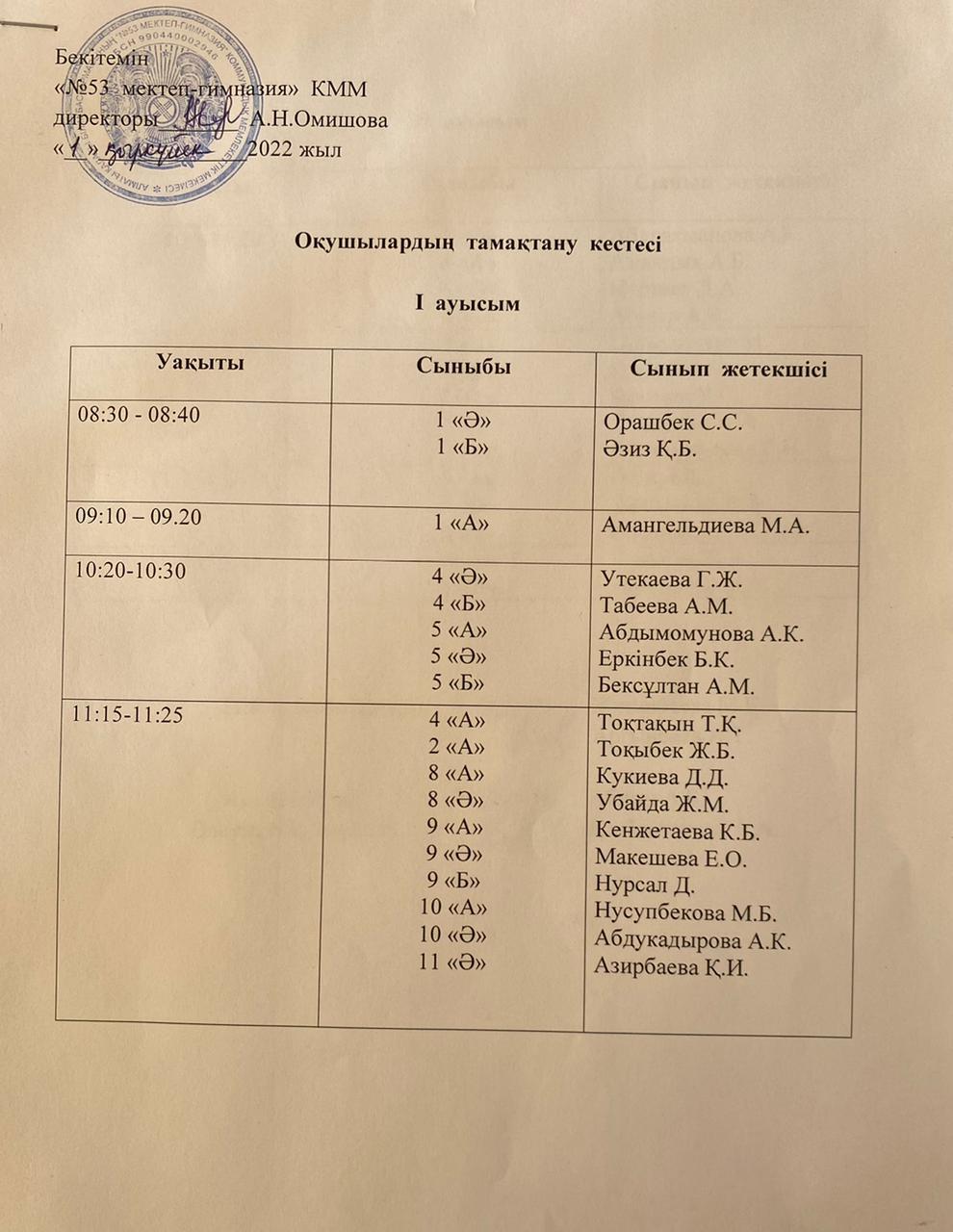 Оқушылардың тамақтану кестесі