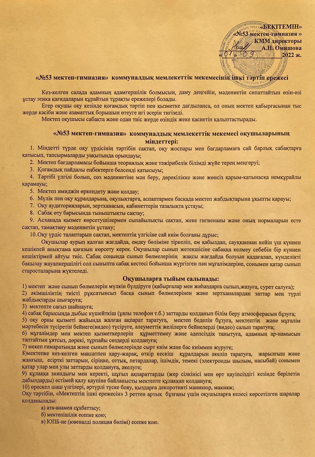 » "Ішкі тәртіп ережесі және оқушылар міндеттері"