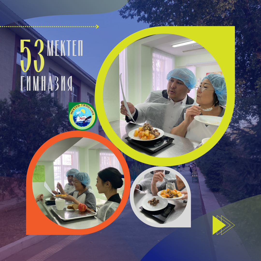 Тамақтың сапасын тексеру жөніндегі бракераждық комиссия мүшелері және мектеп медбикесі Гульбану Аманбаева асханаға барды.