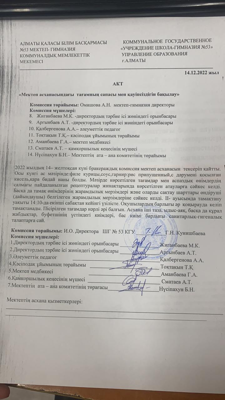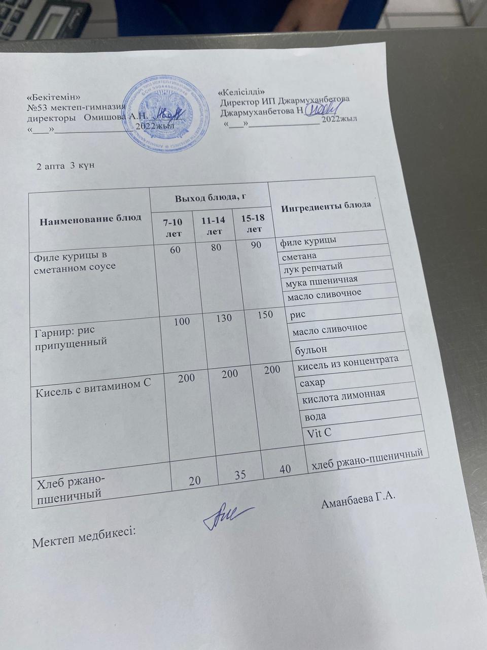 Мәзірде көрсетілген тағамдар мен аспаздық өнiмдердiң атаулары мен салмағы пайдаланылған рецептуралар жинақтарында көрсетiлген атауларға сәйкес. Басқа да тамақ өнiмдерiнiң жарамдылық мерзiмдерi және оларды сақтау шарттары өндіруші (дайындаушы) белгiлеген жарамдылық мерзiмге сәйкес. Асханашылар үстiндегi киiмдерi, бас киімі барлығы санитарлық-гигеналық талаптарға сай.
