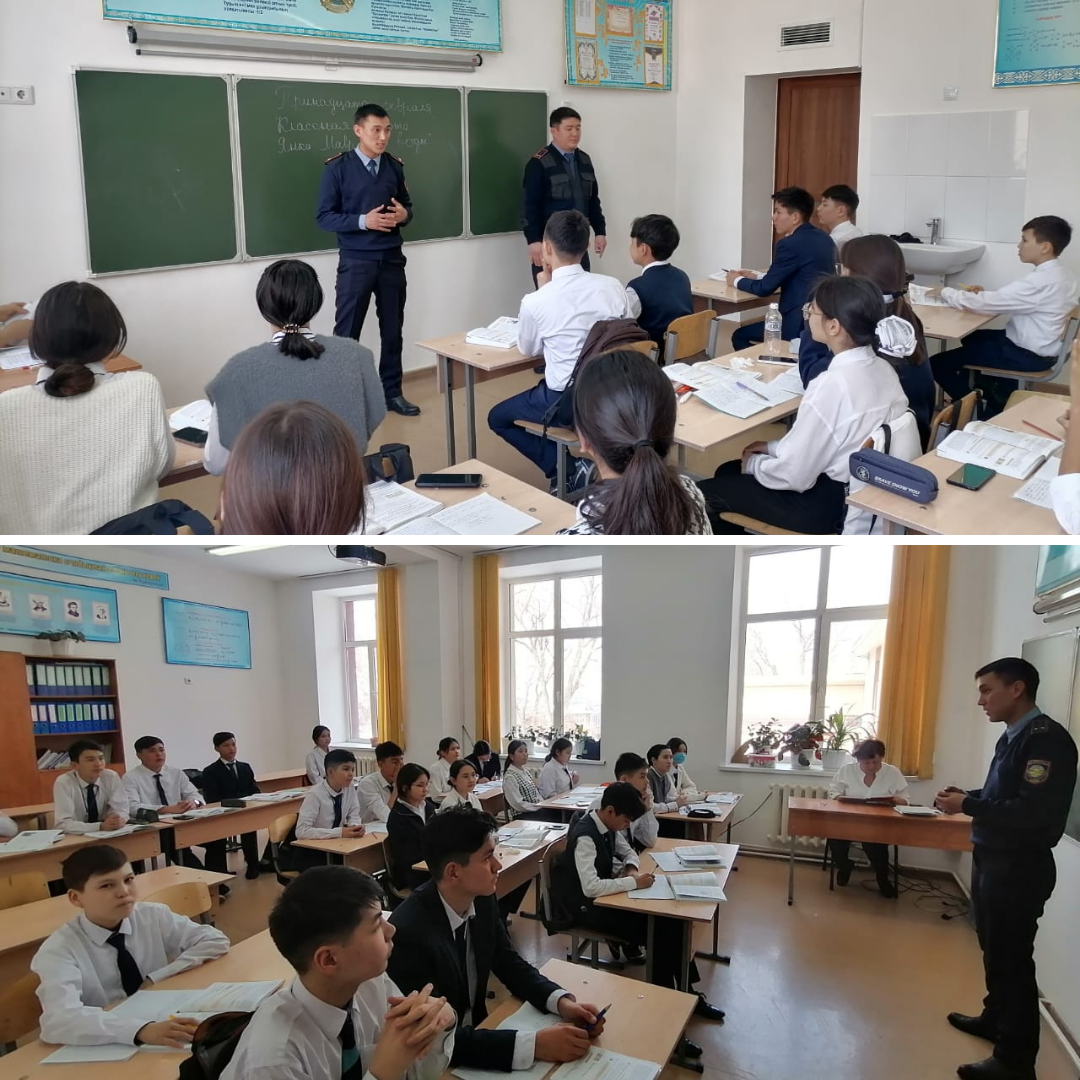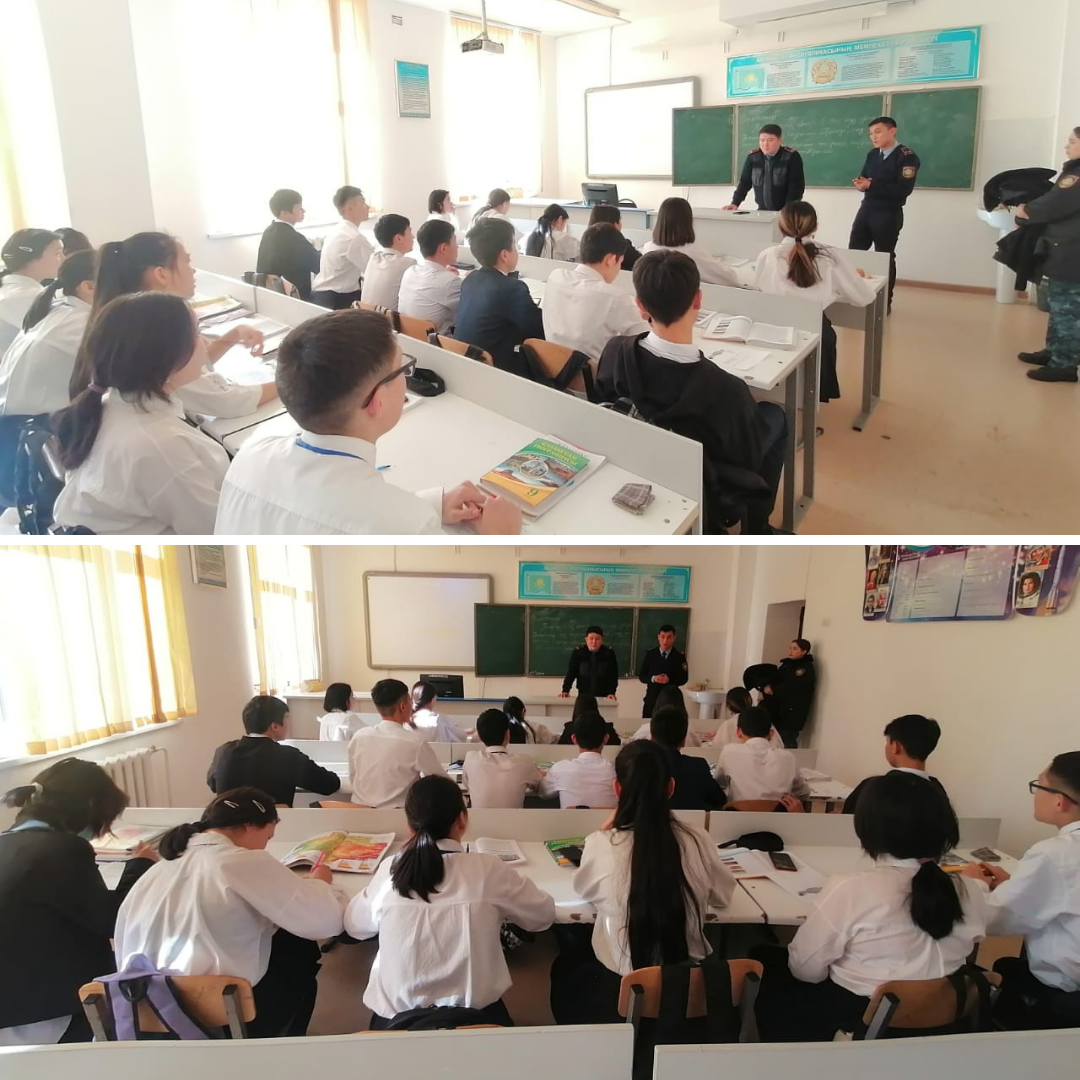 Мектеп инспекторы Айдар Асхатулы мен директордың тәрбие ісі жөніндегі орынбасары Арман Токтасынович 5-8 сынып оқушыларына өрт қауіпсіздігі, жолда жүру ережелерін, тәртіп сақтау мәселелері жөнінде дәріс оқыды.