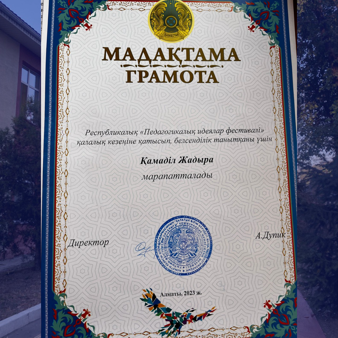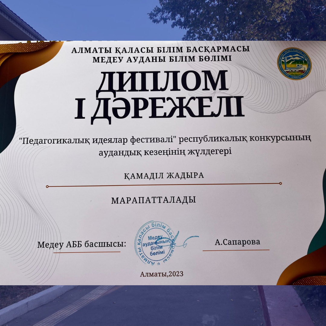 «Алматы дарыны» дарынды балалар мен талантты жастарды анықтау және қолдау жөніндегі орталығы» ұйымдастыруымен «Педагогикалық идеялар фестивалі» республикалық конкурсының аудандық кезеңінде I ОРЫН мен қалалық кезеңінде МАДАҚТАМА иеленді.