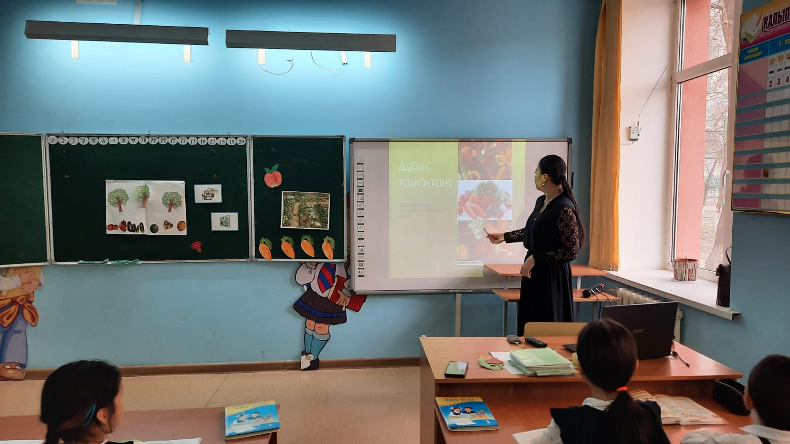 2022 жылдың 21 қыркүйегінде 2 «Ә» сынып оқушыларымен сынып жетекшісі- Абдрахманова А. К. «Дұрыс тамақтану –денсаулық кепілі» тақырыбында ашық сабақ өткізді. Сабақтың мақсаты: Оқушылардың дұрыс тамақтану туралы білімдерін жүйелеу , кеңейту, тазалыққа баулу.