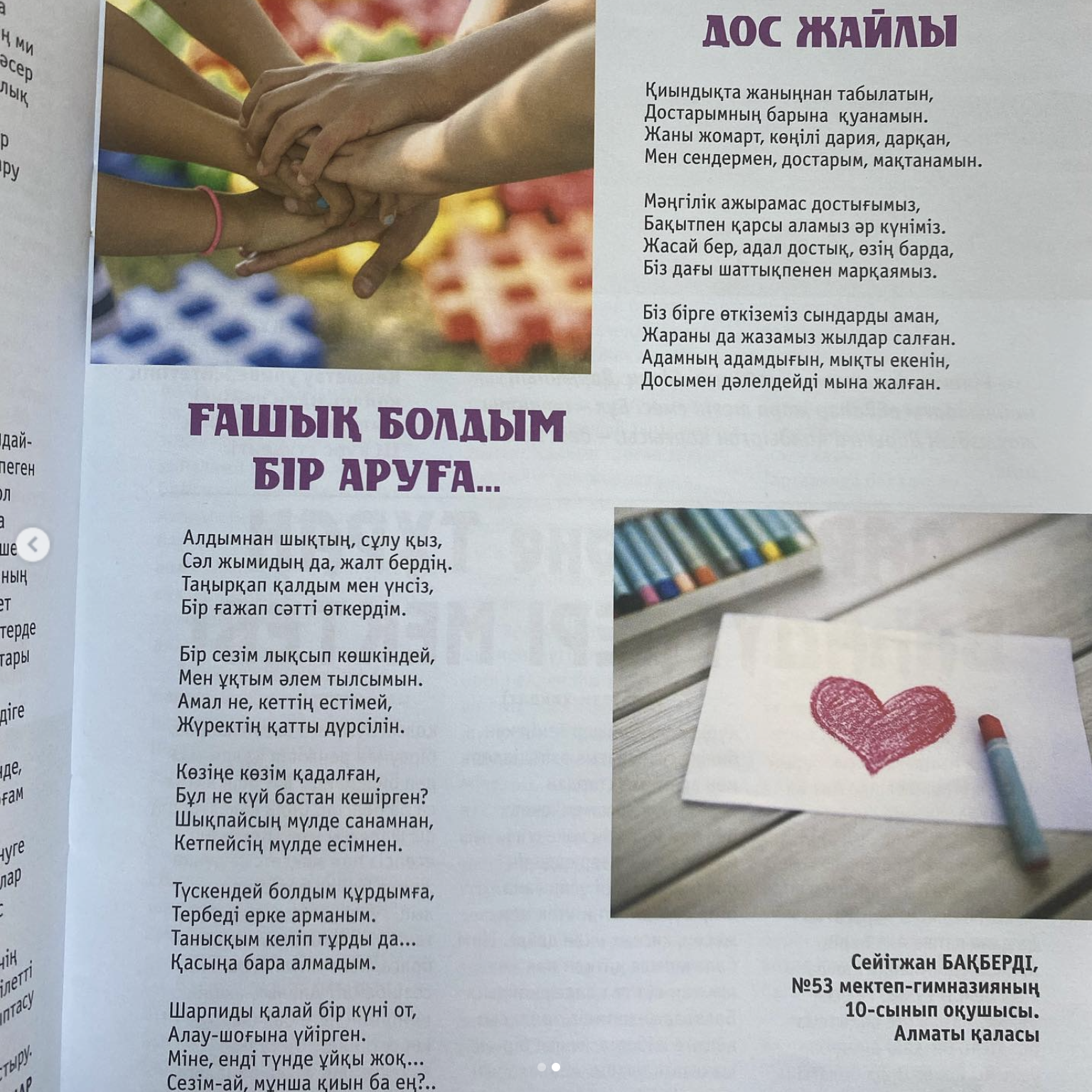 Гимназиямыздың оқушысы Сейітжан Бақбердінің «Дос жайлы», «Ғашық болдым бір аруға» тақырыбындағы өлеңдері жасөспірімдерге арналған республикалық «Aq jelken» журналына шықты 🥳