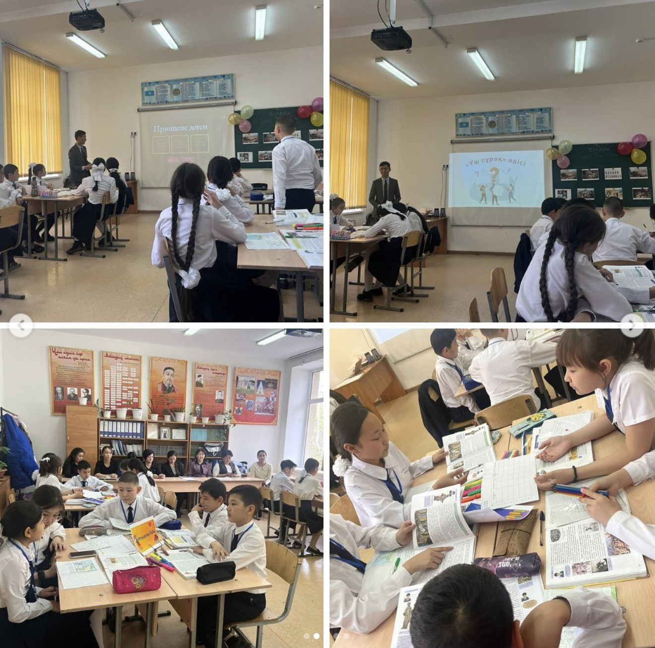 Сабақта flippity.net сайты арқылы топқа бөлініп, Wodwall платформасымен үй жұмысын сұрақтарға жауап беру арқылы өткізді. «Үш сұрақ», «Біреуі үйде, үшеуі қонақта», «Кластер» әдіс-тәсілдерімен сабақ ашылып, YouTube платформасы арқылы «Кел, билейік, балақай» сергіту сәтін өткізді. Ашық сабаққа қатысқан мұғалімдер оң бағасын берді.
