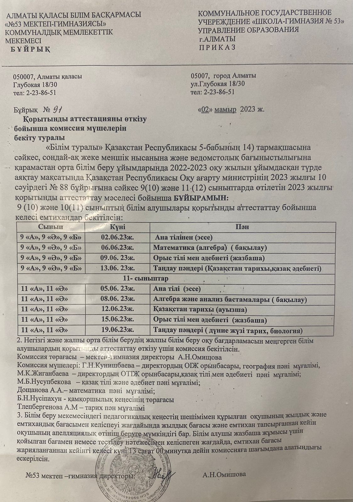 » Қорытынды аттестацияны өткізу бойынша комиссия мүшелерін бекіту туралы