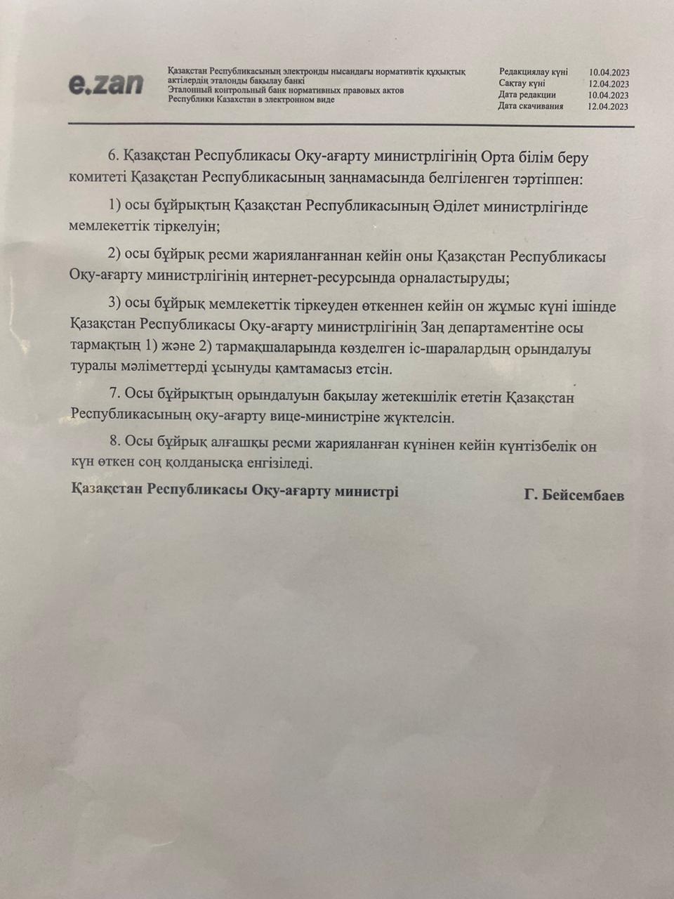 12 апрель 2023 0 1 2 3 4 5 2022-2023 оқу жылын аяқтау және орта білім беру ұйымдарында білім алушыларды қорытынды аттестатциялаудан өткізу мерзімдерін бекіту туралы