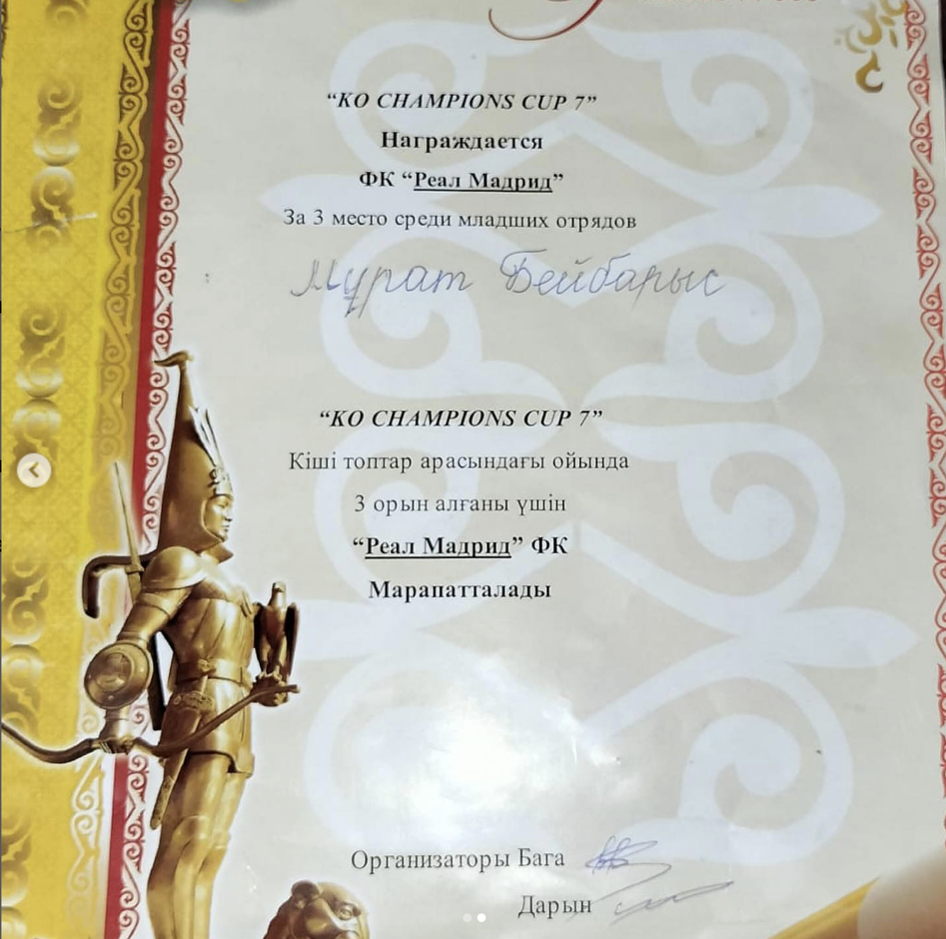 «KO CHAMPIONS CUP 7» кіші топтар арасындағы ойында ІІІ орын алғаны үшін «Реал Мадрид» ФК марапатталды.