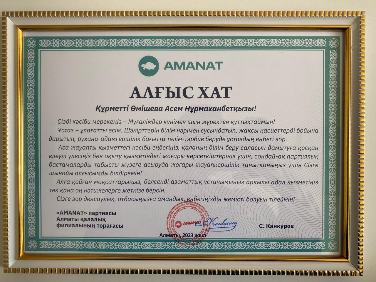 Омишова Асем Нурмуханбетовнаға АЛҒЫС ХАТ табысталды 🥳