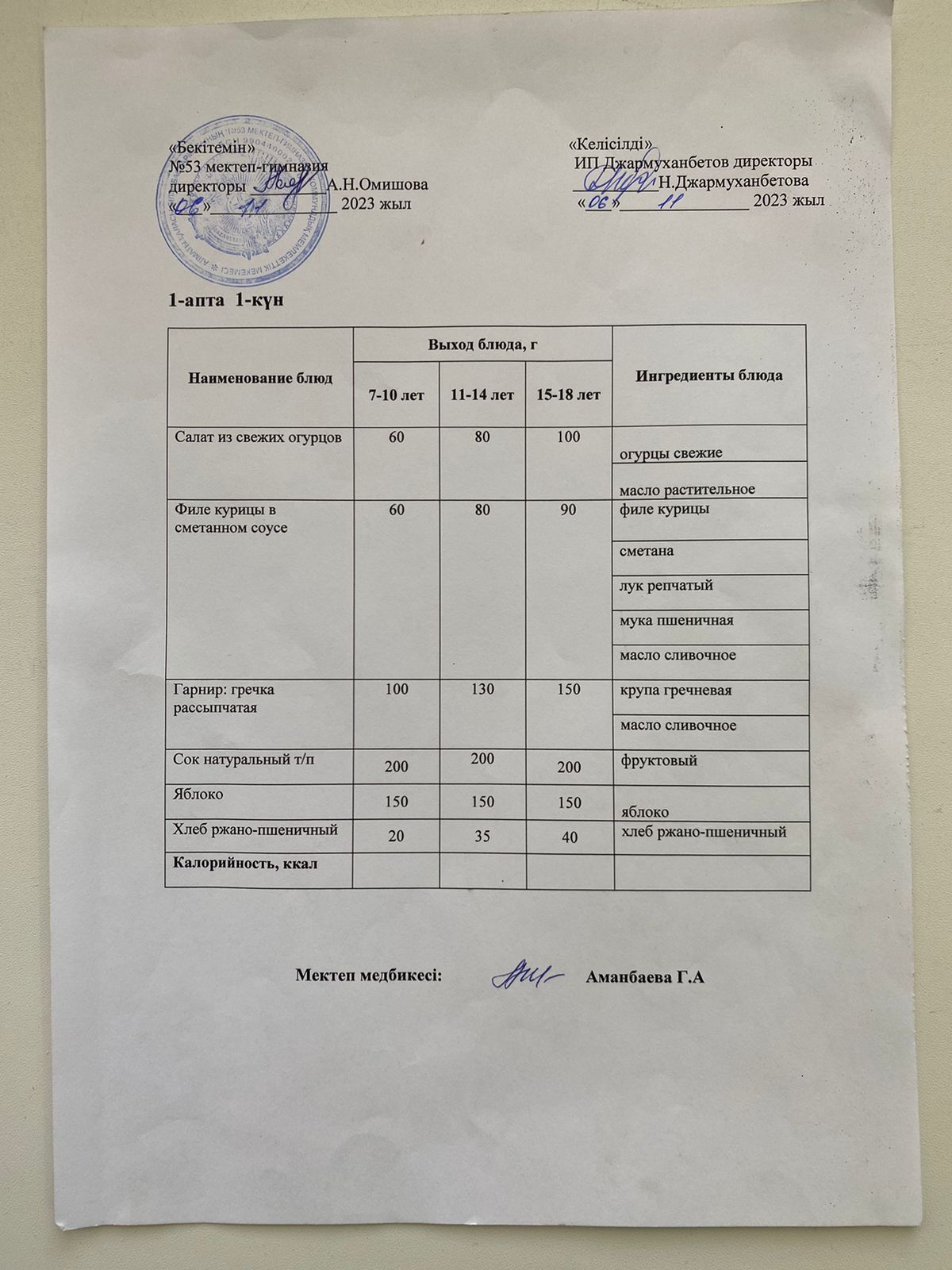 Омишова Асем Нурмуханбетовна мен ата-ана бастаған бракераждық комиссия мүшелері мектебіміздегі асхананың тазалығы мен тамақтандырудың сапалық құрамын, мәзір мөлшеріне тексеріс жүргізді. Тексеріс барысында ас дайындайтын, сақтайтын орындарға кіріп, азық-түліктің сақтау мерзімі, сақталу орны мемлекеттік нормаларға сай келетініне, құжаттық қағидаттарды сақтайтынына көз жеткізіп ризашылығын білдіріп, оң бағасын берді.