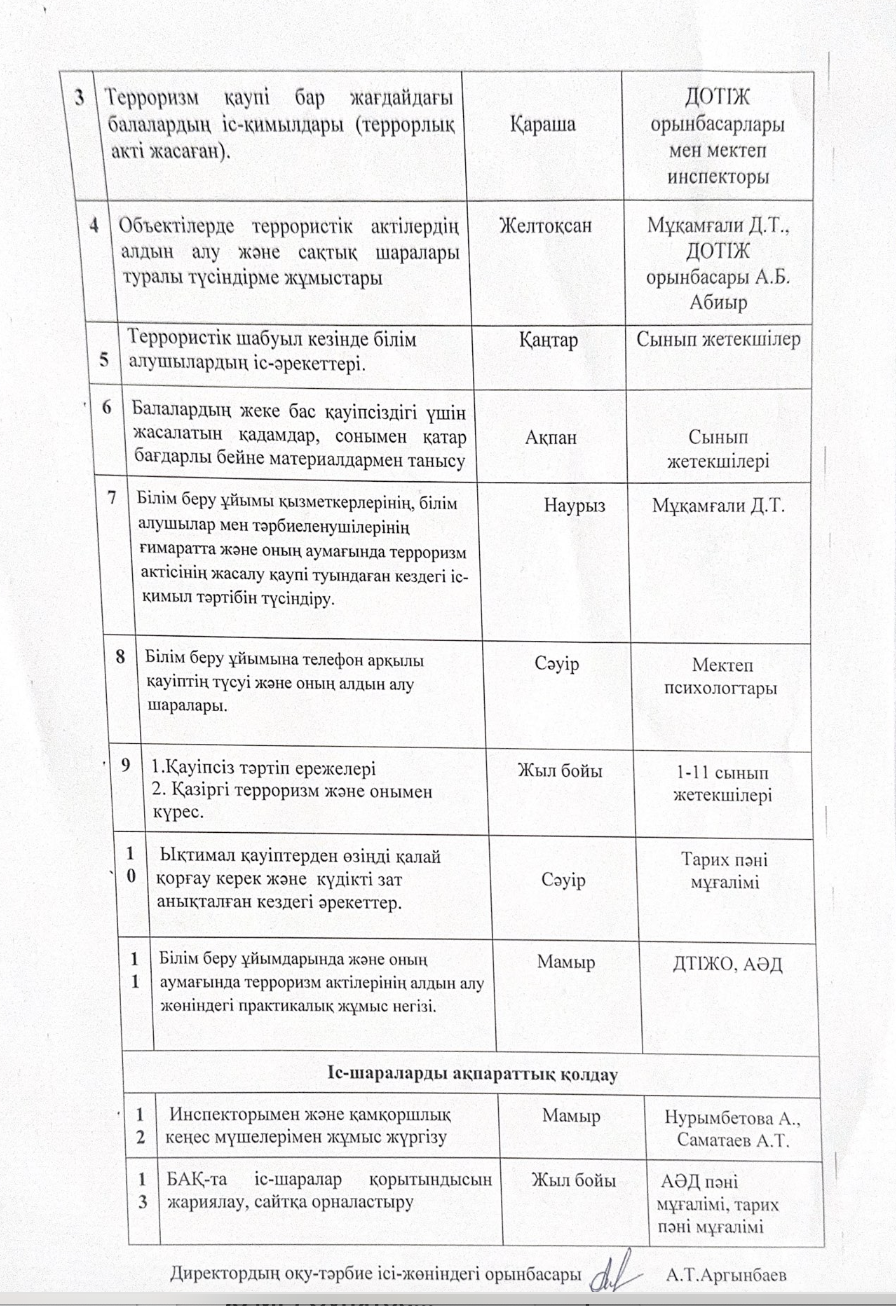 2024-2025 лқу жылының "ҚР-ның білім беру саласындағы қызметті жүзеге асыратын террористтік тұрғыдан осал объектілерінің терроризмге қарсы қорғалуын ұйымдастыру" туралы іс-шаралар жоспары