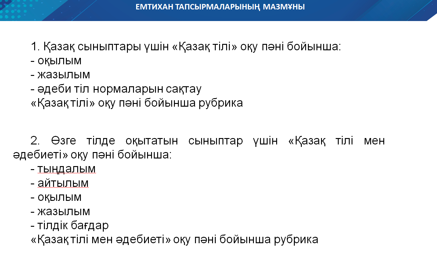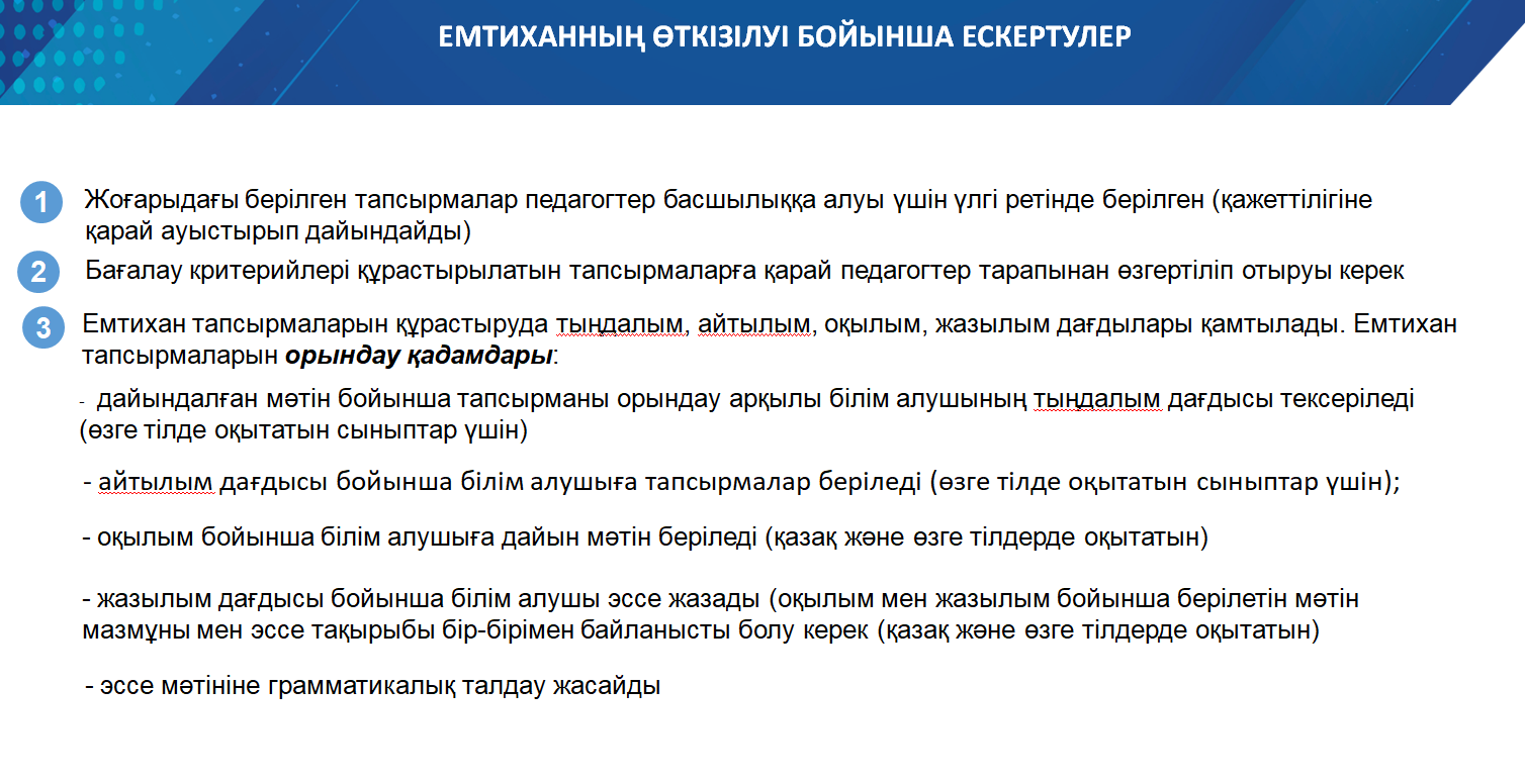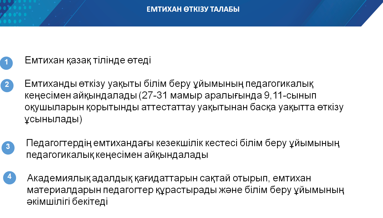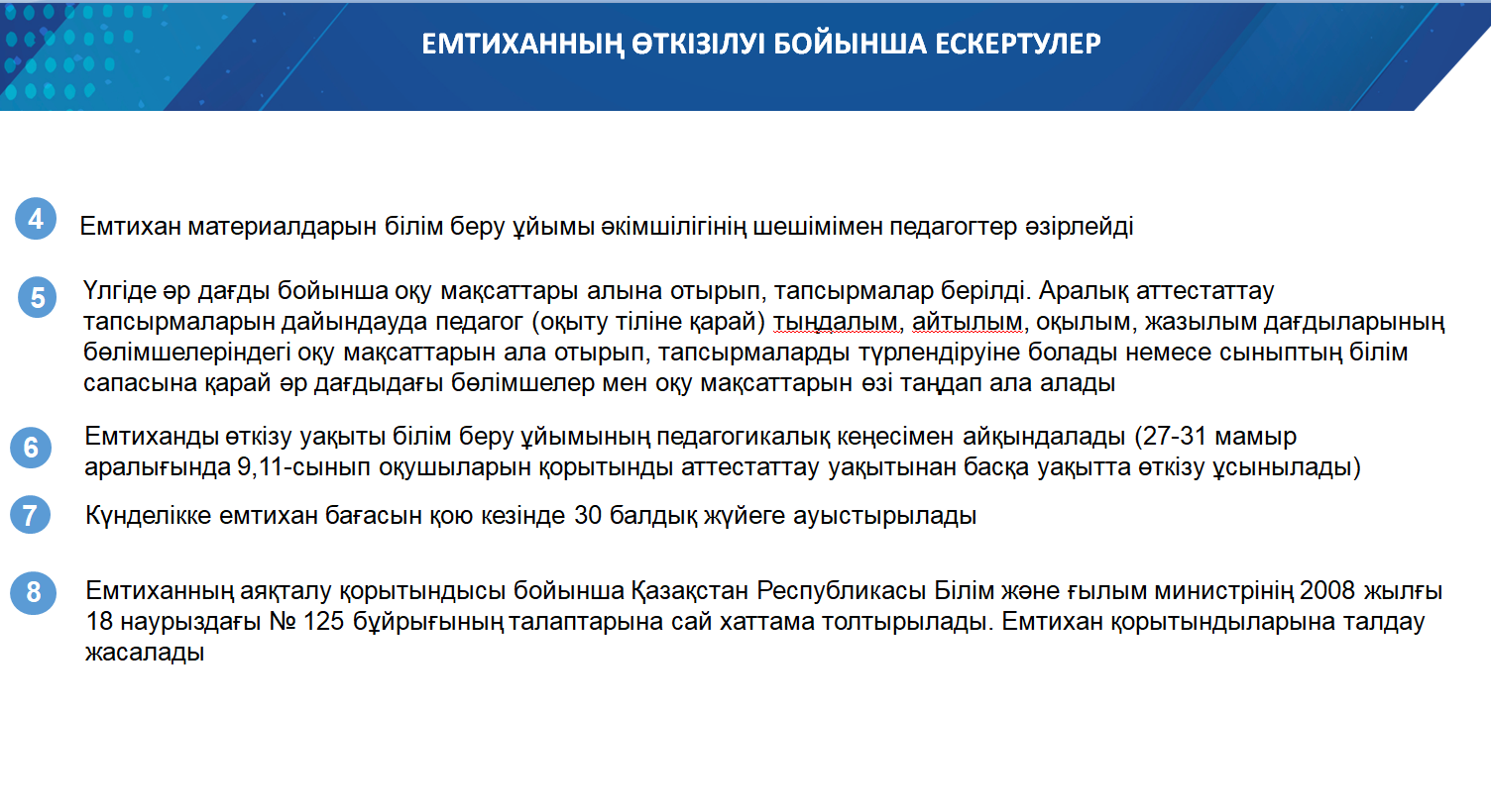 05 май 2025 0 1 2 3 4 5 Білім алушыларға "Қазақ тілі", "Қазақ тілі мен әдебиеті" пәндерінен 5-8, 10-сыныптарда емтихан өткізу тәртібі