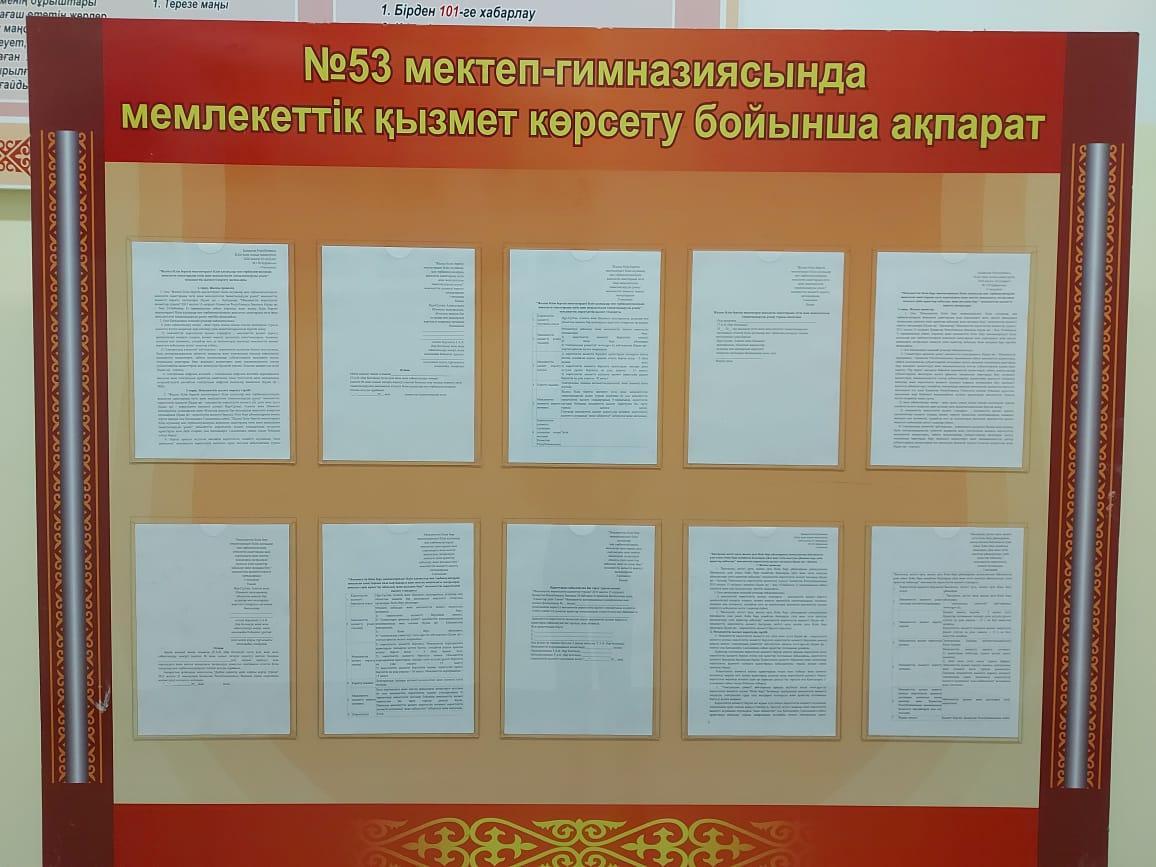 12 ноябрь 2020 0 1 2 3 4 5 "Мемлекеттік қызмет көрсету" "Мемлекеттік қызмет көрсету" стендіндегі ақпарат жаңартылды. #53 мектеп-гимназиясында мемлекеттік қызмет көрсетудің 3 түрімен жұмыс жасайды.