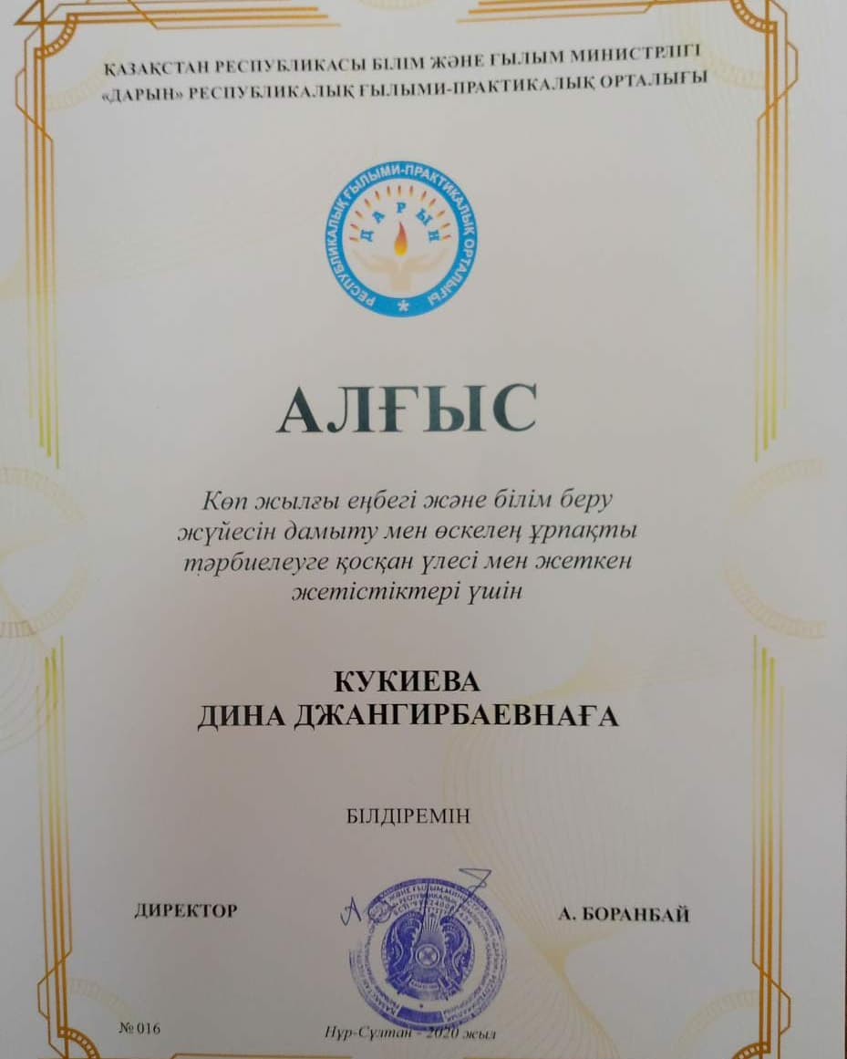 Қазақстан Республикасы Білім және Ғылым министрлігі "Дарын" Республикалық ғылыми практикалық орталығы №53 мектеп-гимназиясының математика пәнінің мұғалімі Кукеева Дина Джангирбаевнаға көп жылғы еңбегі және білім беру жүйесін дамыту мен өскелең ұрпақты тәрбиелеуге қосқан үлесі мен жеткен жетістіктері үшін өз алғыстарын білдіре отырып, алғыс хатын жолдады. #53мектепгимназия #қашықтықтаноқыту #білім #ғылым #жетістік #тәуелсіздікке30жыл #еңбек #тәжірибе @edu.almaty @akimat_almaty @akimat_medeu @medeuustaz @medeu_roo @almatydaryny @daryn.online