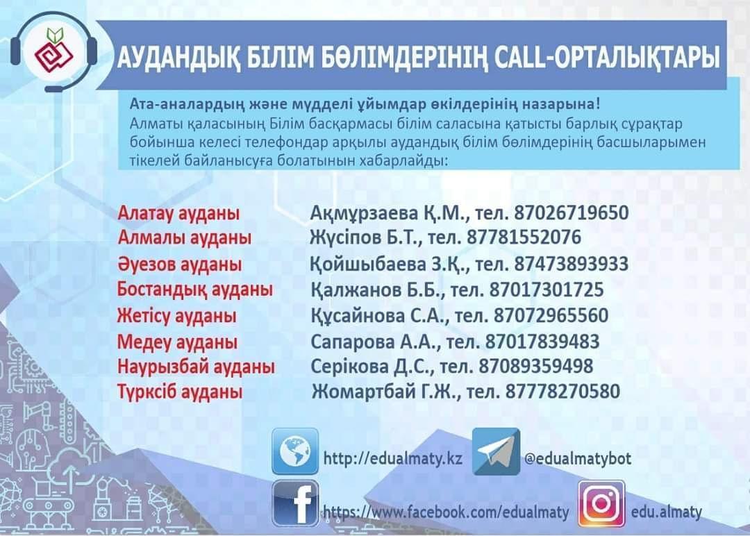 30 март 2021 0 1 2 3 4 5 Ата-аналар назарына!📢 🔴Ата-аналардың және мүдделі ұйымдар өкілдерінің назарына❗ Алматы қаласының Білім басқармасы білім саласына қатысты барлық сұрақтар бойынша келесі телефондар арқылы аудандық білім бөлімдерінің басшыларымен тікелей байланысуға болатынын хабарлайды.