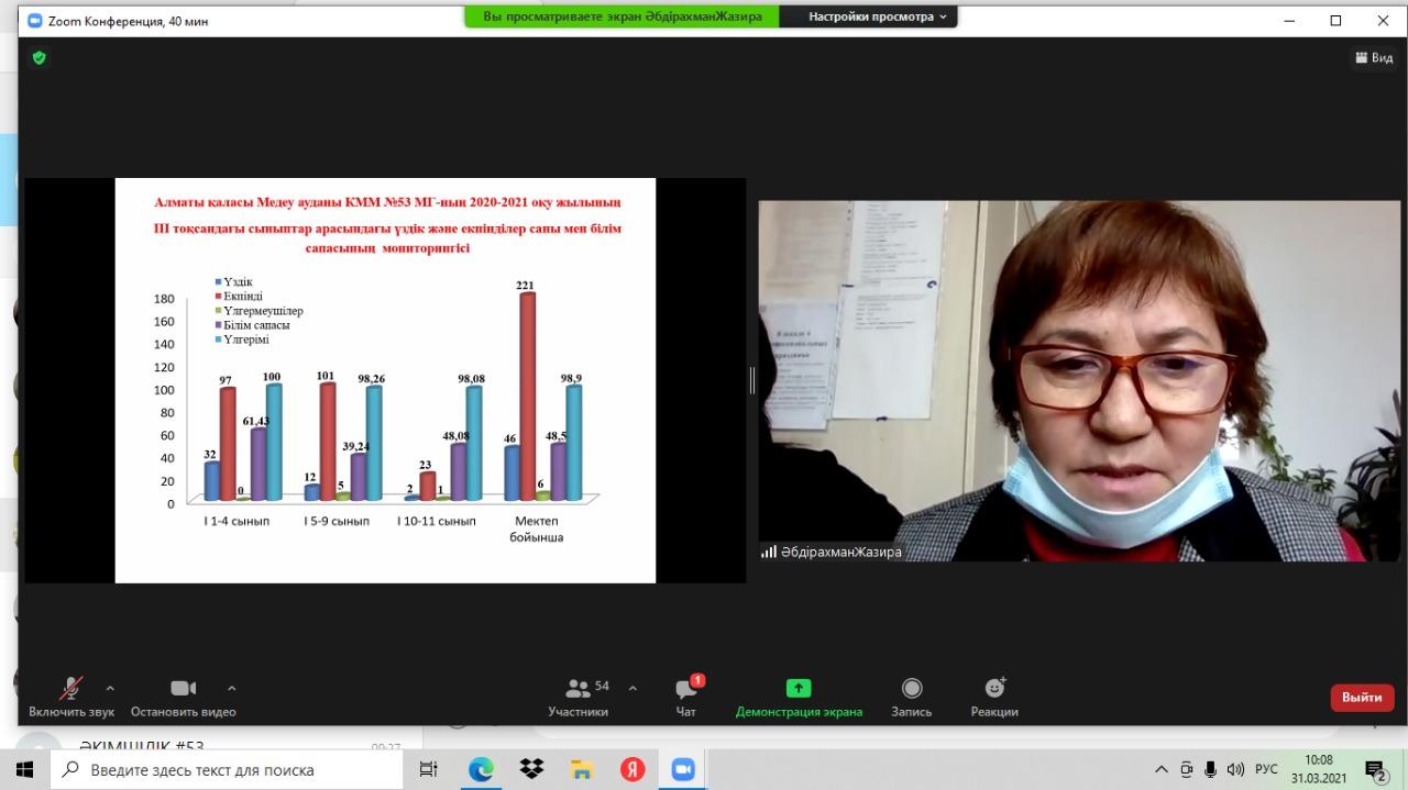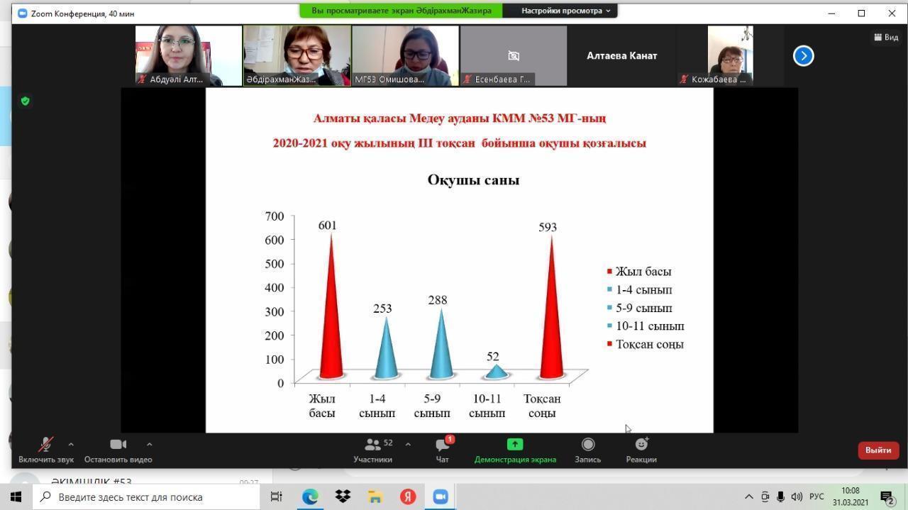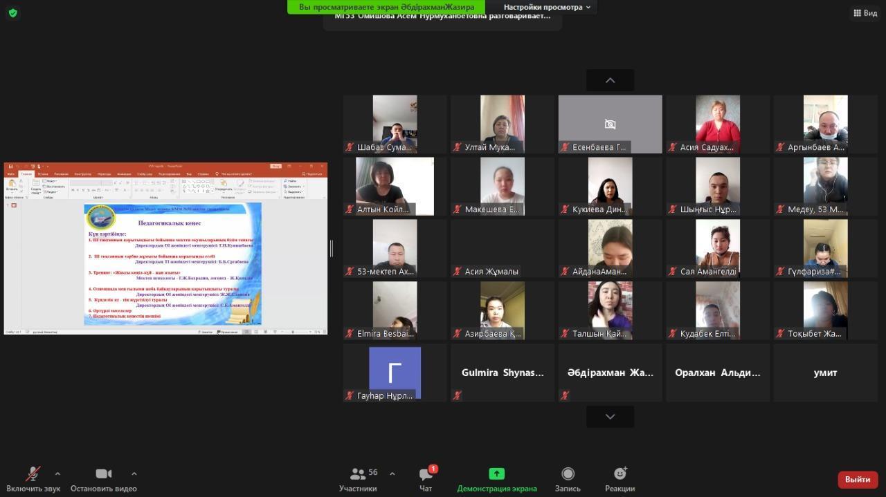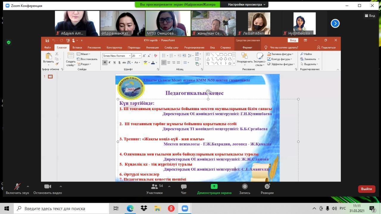 Алматы қаласы Медеу ауданы №53 мектеп-гимназиясында наурыз айының 31 жұлдызы күні кезекті педагогикалық кеңес онлайн форматта "ZOOM" платформасымен өтті. Күн тәртібінде төмендегі мәселелер қаралды: 1) III тоқсанның қорытындысы бойынша мектеп оқушыларының білім сапасы. Баяндама оқыған мектеп-гимназиясының оқу ісі жөніндегі орынбасары Кунишбаева Гульнар Нуржумаевна. 2) Олимпиада мен ғылыми жоба байқауларының қорытындысы туралы Директорлың ОІ жөніндегі орынбасары: Ж.Ж.Сламова. 3) III тоқсанның тәрбие жұмысы бойынша қорытынды есебі; мектеп-гимназиясының тәрбие ісі жөніндегі орынбасары Сргабаева Балжан Баймукановна. 4) Тренинг: "Көңіл көтеріңкі ұстаздың, еңбегі жемісті болады". Мектеп-психологы Бахрадин Гулфариза Жәдігерқызы, мектеп-логопеді Қамаділ Жадыра; 5) Kundelik.kz - тің жүргізілуі туралы Директордың ОІ жөніндегі орынбасары С.Е.Амангелді. 6) Әртүрлі мәселелер; 7) Педагогикалық кеңестің шешімі; #53мектепгимназия #педкеңес #қашықтықтаноқыту @akimat_almaty @akimat_medeu @medeuustaz @medeu_roo