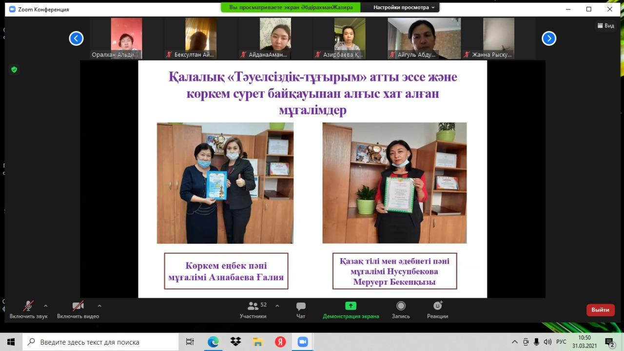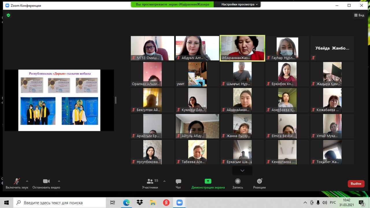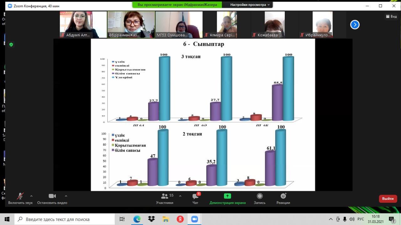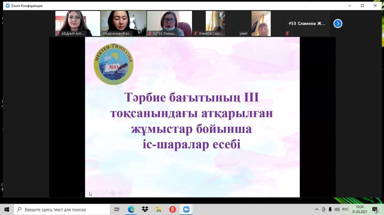 Алматы қаласы Медеу ауданы №53 мектеп-гимназиясында наурыз айының 31 жұлдызы күні кезекті педагогикалық кеңес онлайн форматта "ZOOM" платформасымен өтті. Күн тәртібінде төмендегі мәселелер қаралды: 1) III тоқсанның қорытындысы бойынша мектеп оқушыларының білім сапасы. Баяндама оқыған мектеп-гимназиясының оқу ісі жөніндегі орынбасары Кунишбаева Гульнар Нуржумаевна. 2) Олимпиада мен ғылыми жоба байқауларының қорытындысы туралы Директорлың ОІ жөніндегі орынбасары: Ж.Ж.Сламова. 3) III тоқсанның тәрбие жұмысы бойынша қорытынды есебі; мектеп-гимназиясының тәрбие ісі жөніндегі орынбасары Сргабаева Балжан Баймукановна. 4) Тренинг: "Көңіл көтеріңкі ұстаздың, еңбегі жемісті болады". Мектеп-психологы Бахрадин Гулфариза Жәдігерқызы, мектеп-логопеді Қамаділ Жадыра; 5) Kundelik.kz - тің жүргізілуі туралы Директордың ОІ жөніндегі орынбасары С.Е.Амангелді. 6) Әртүрлі мәселелер; 7) Педагогикалық кеңестің шешімі; #53мектепгимназия #педкеңес #қашықтықтаноқыту @akimat_almaty @akimat_medeu @medeuustaz @medeu_roo