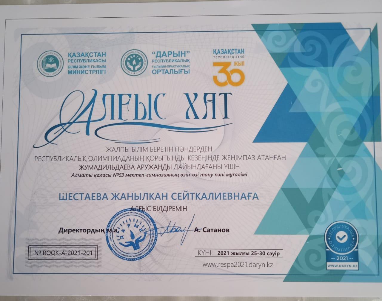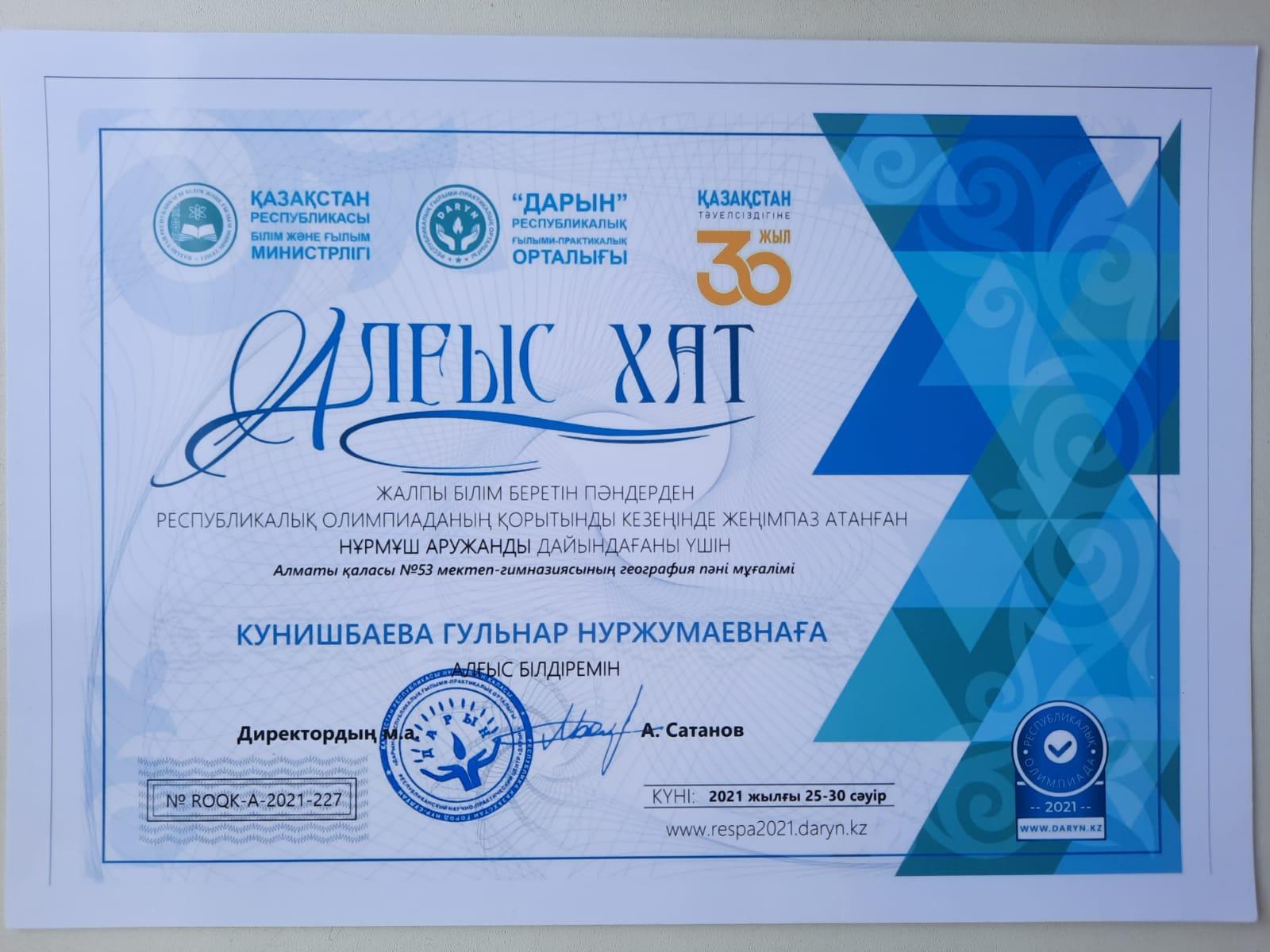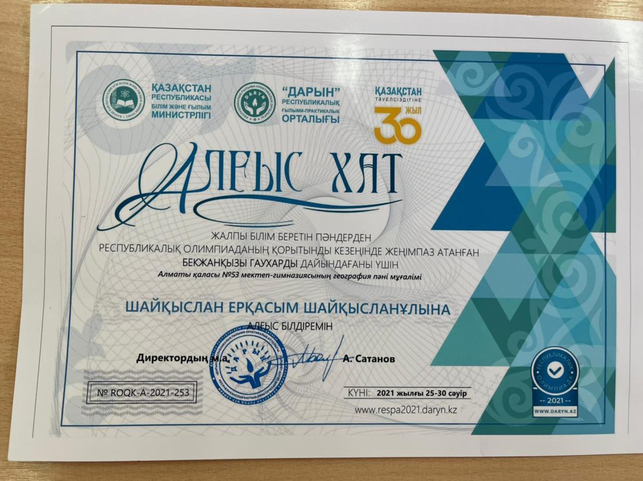 Алматы қаласы Медеу ауданы №53 мектеп-гимназиясында 2021-2022 оқу жылы ұстаздарымыз құрмет грамотасын, алғыс хаттарын алумен бастады. Мектеп-гимназия директоры Омишова Асем Нурмуханбетовна ұстаздарды құрмет грамотасымен, алғыс хаттарымен марапаттады. Атап айтсақ: ҚР білім беру жүйесін дамытуға және өскелең ұрпаққа тәрбие мен білім берудегі қол жеткізген табыстары үшін Кунишбаева Гульнар Нуржумаевна құрмет грамотасымен, Кунишбаева Гульнар Нуржумаевна жалпы білім беретін пәндерден география пәні бойынша республикалық олимпиадада жеңімпаз атанған Нұрмұш Аружанды дайындағаны үшін, Шестаева Жанылхан Сейткалиевна жалпы білім беретін пәндерден өзін-өзі тану пәні бойынша республикалық олимпиадада жеңімпаз атанған Жумадильдаева Аружанды дайындағаны үшін , Шайқыслан Ерқасым Шайқысланұлы жалпы білім беретін пәндерден география пәні бойынша республикалық олимпиадада жеңімпаз атанған Бекжанқызы Гаухарды дайындағаны үшін, ҚР Білім және ғылым министрлігі, «ДАРЫН» Республикалық ғылыми-практикалық орталығынан алғыс хаттармен марапатталды.