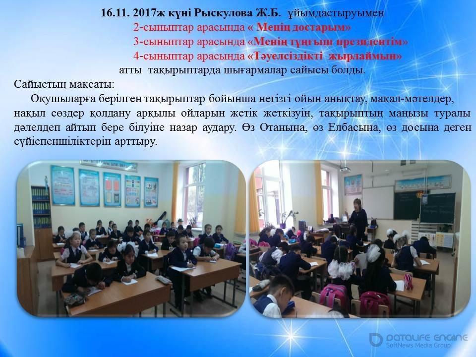 05 декабрь 2017 "Менің достарым", "Менің тұңғыш президентім", "Тәуелсіздікті жырлаймын" тақырыптарында шығарма жазу сайысы