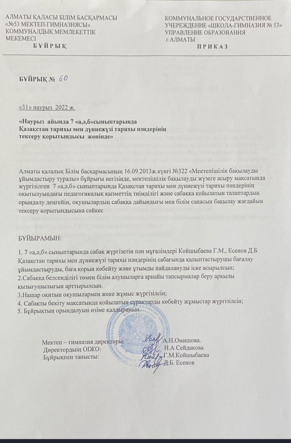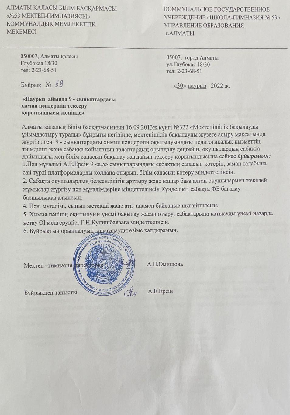 Наурыз айындағы мектепішілік бақылауды ұйымдастыру туралы