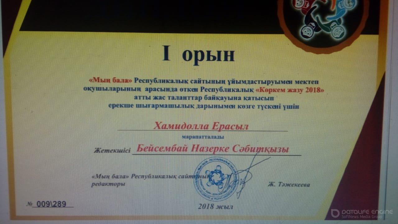 " Мың бала" Республикалық сайтының ұйымдастыруымен мектеп оқушыларының арасында өткен Республикалық "Жас суретші 2018" ерекше шығармашылық дарынымен біздің оқушылар көзге тусті. Жетекшісі Бейсембай Назерке Сәбитқызы байқауға өз шәкірттерін белсенді қатыстырып, өскелең ұрпаққа заман талабына сай сапалы білім мен саналы тәрбие берудің озық үлгісін көрсетті.