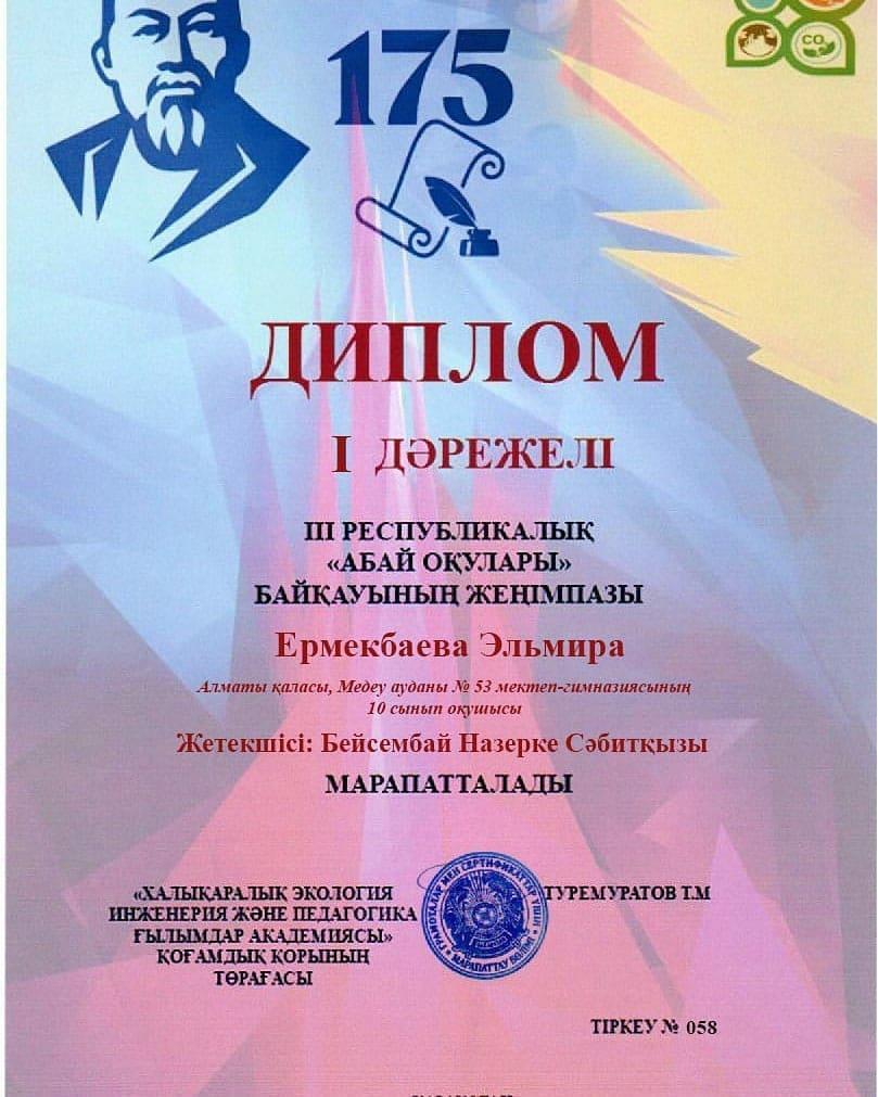 14 май 2020 0 1 2 3 4 5 "Абай оқулары" Жеңістерің құтты болсын, жарайсыңдар қыздар!Бейсембай Назерке Сабитқызы, сізге шығармашылық табыстар тілейміз!