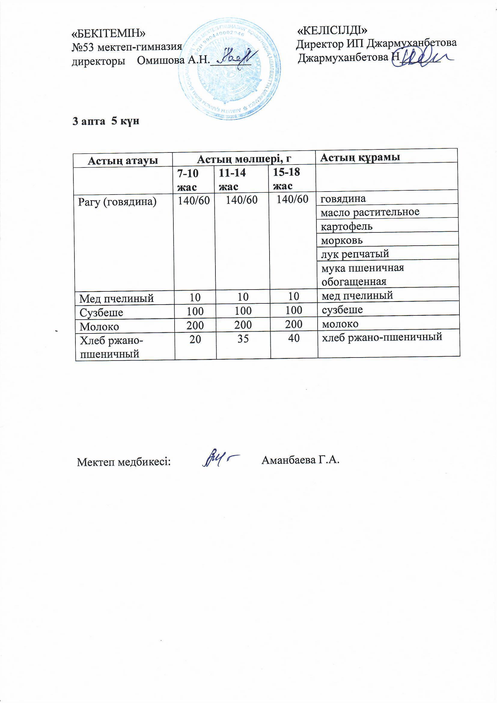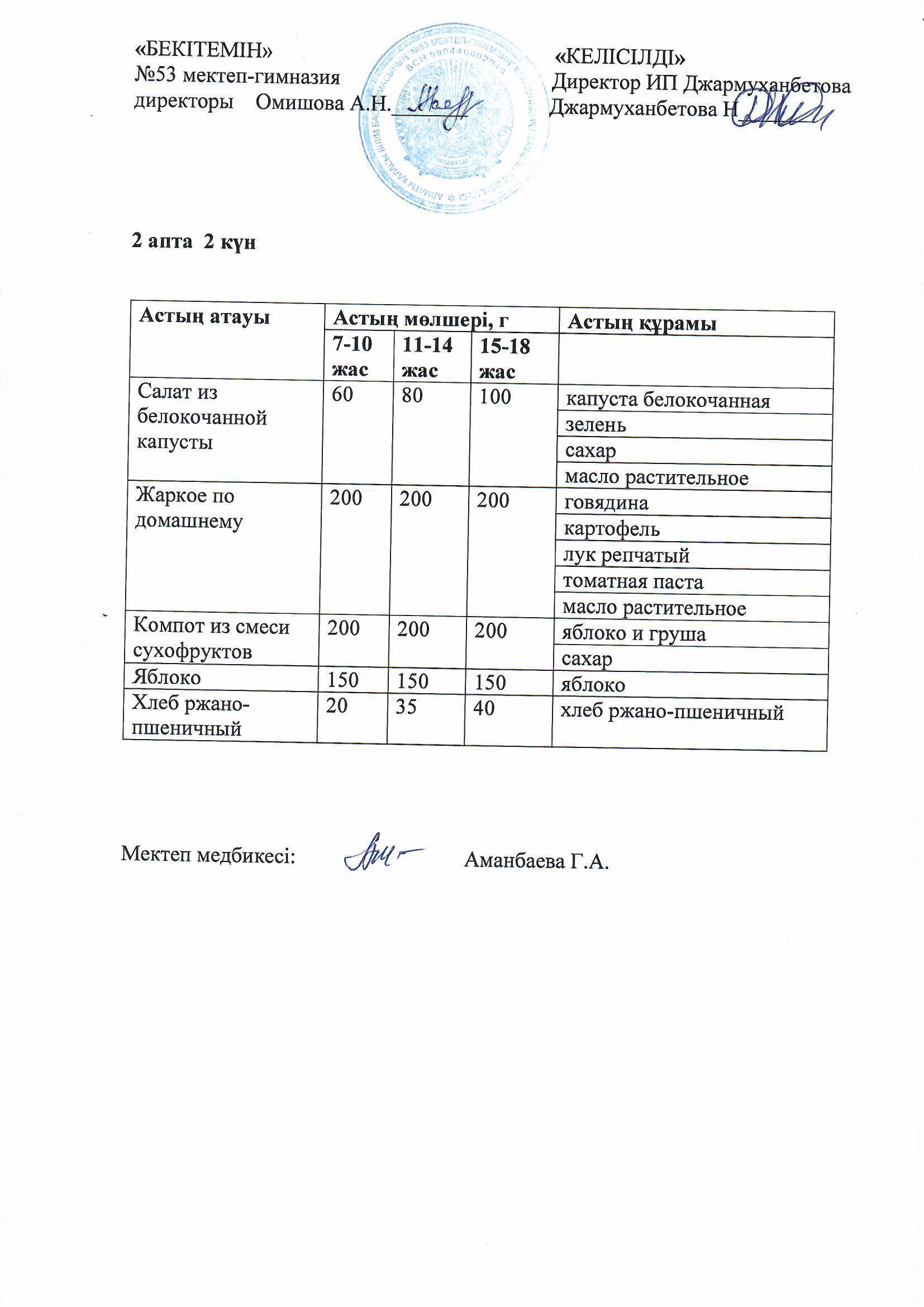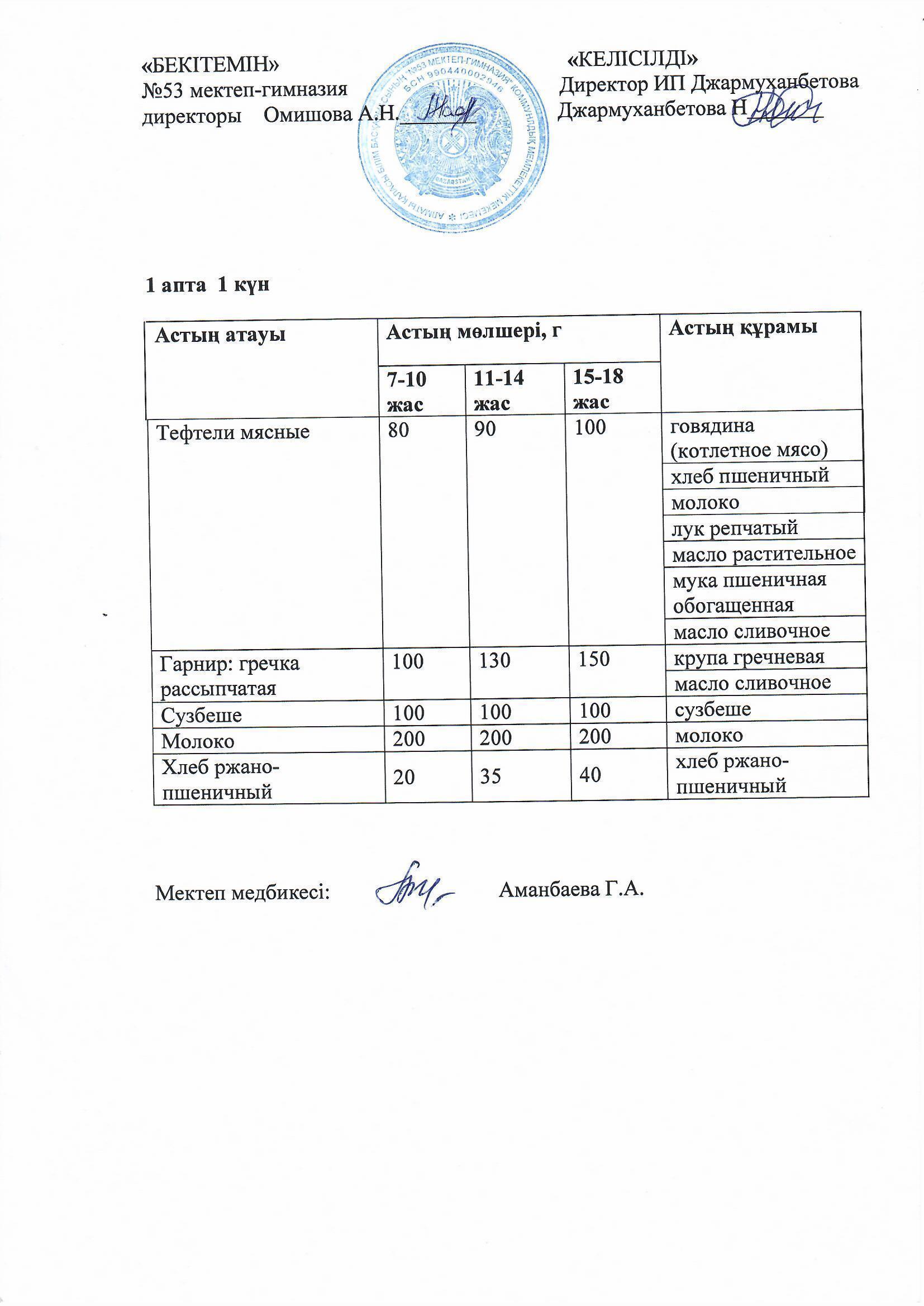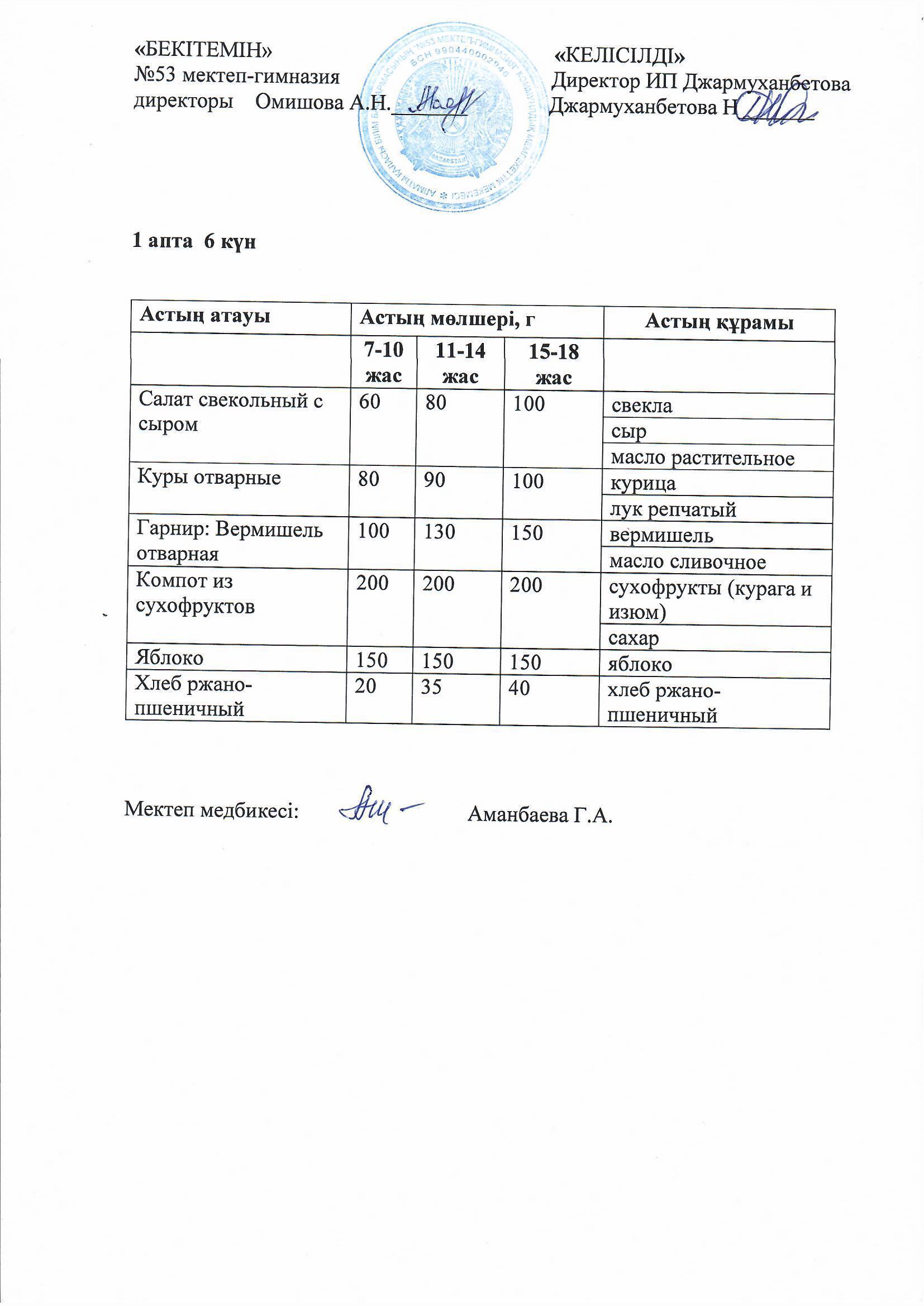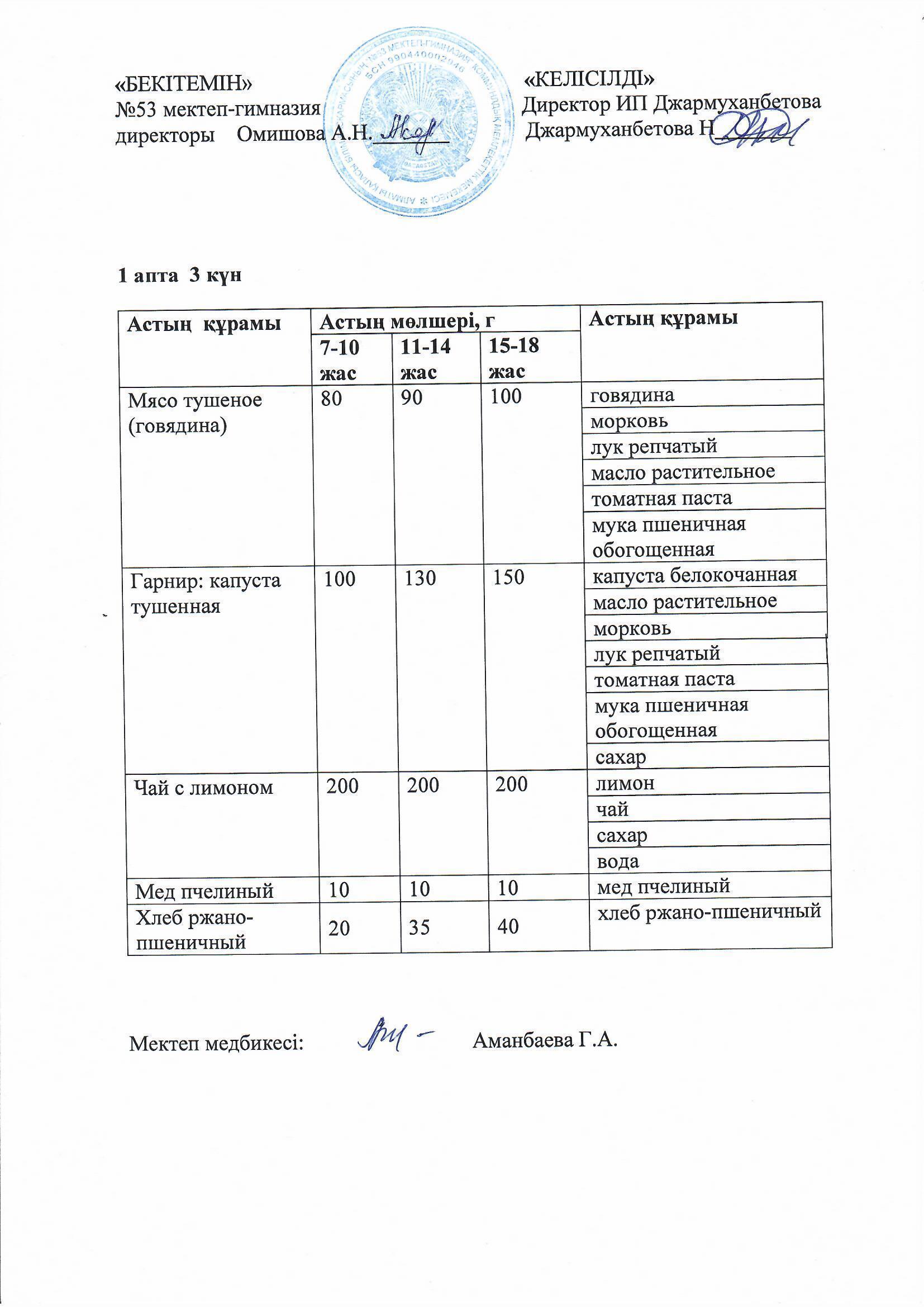 Білім басқармасы тарапынан бекітілген ас мәзірі