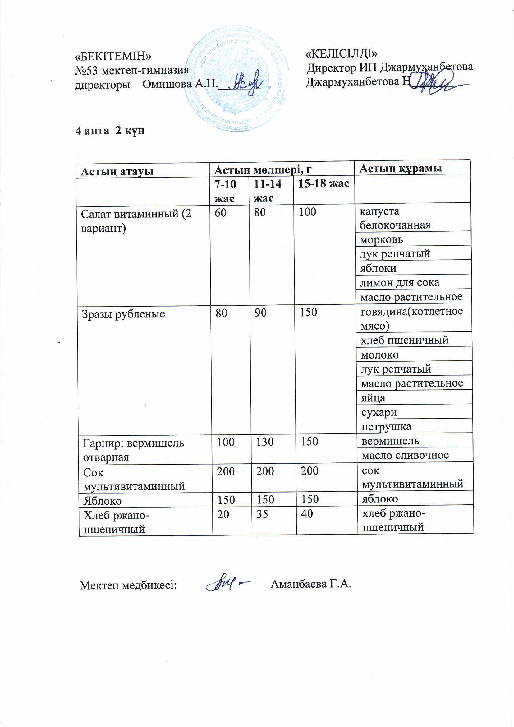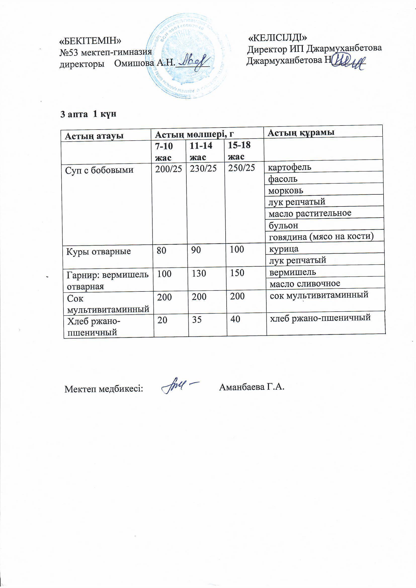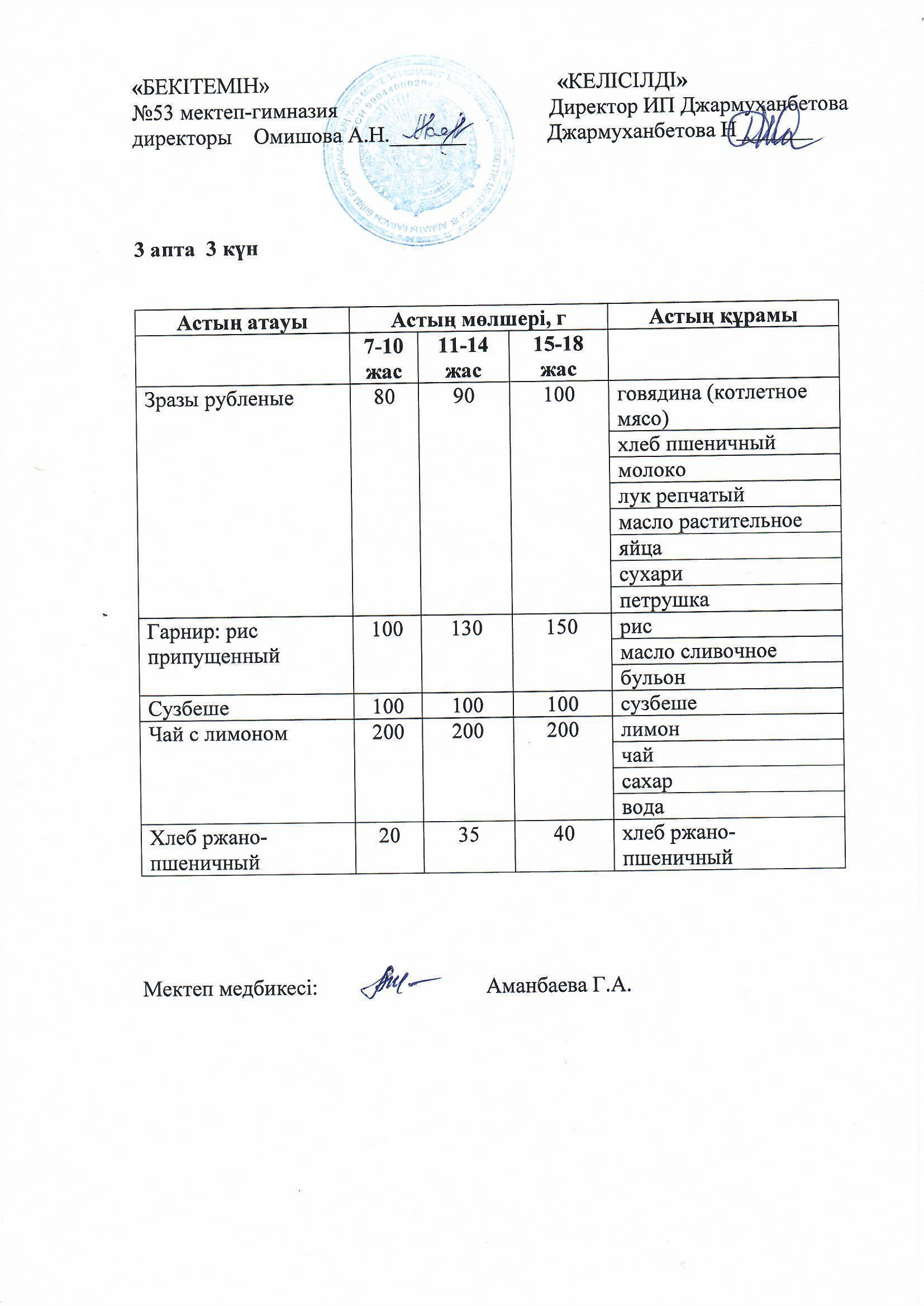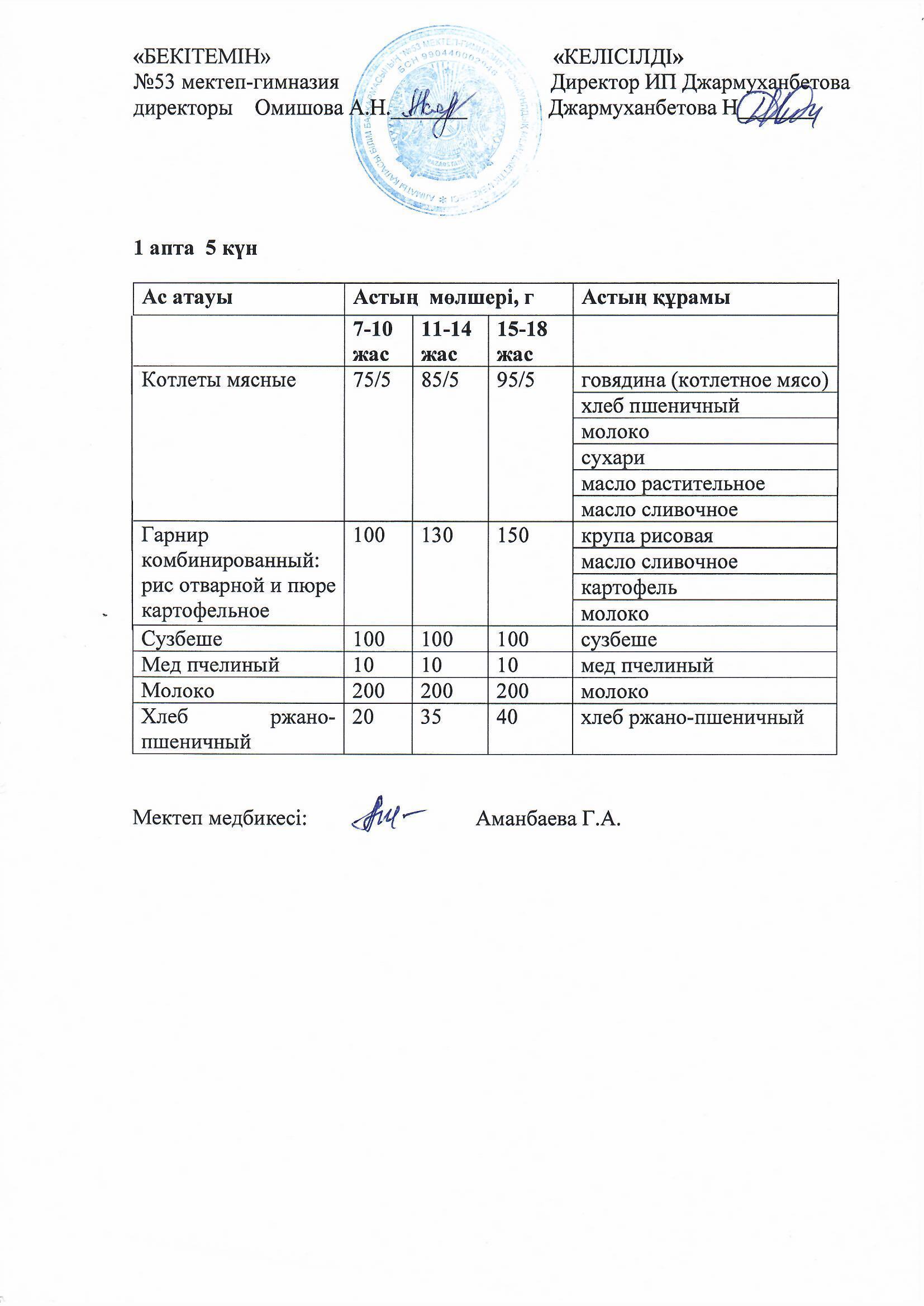 Білім басқармасы тарапынан бекітілген ас мәзірі