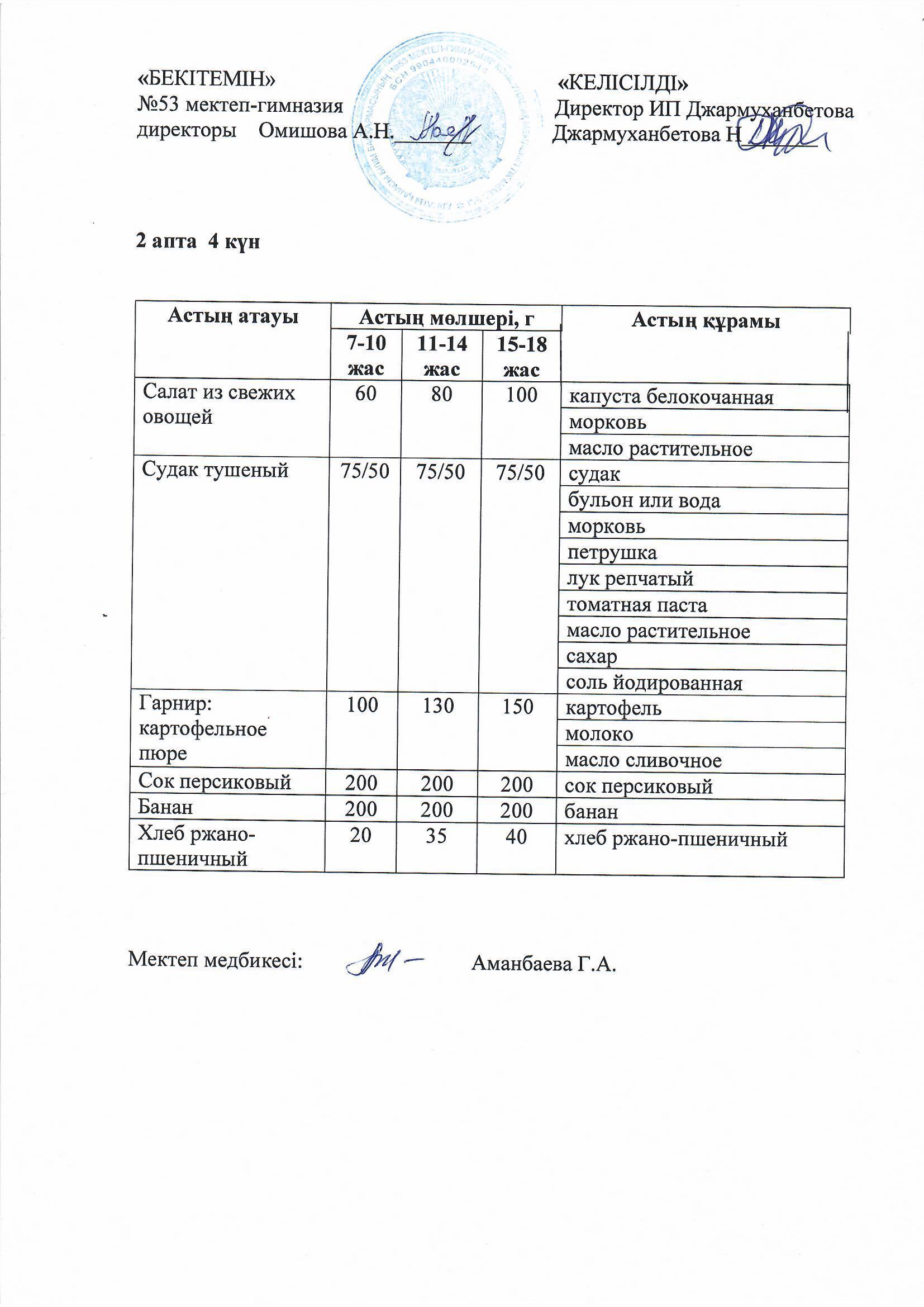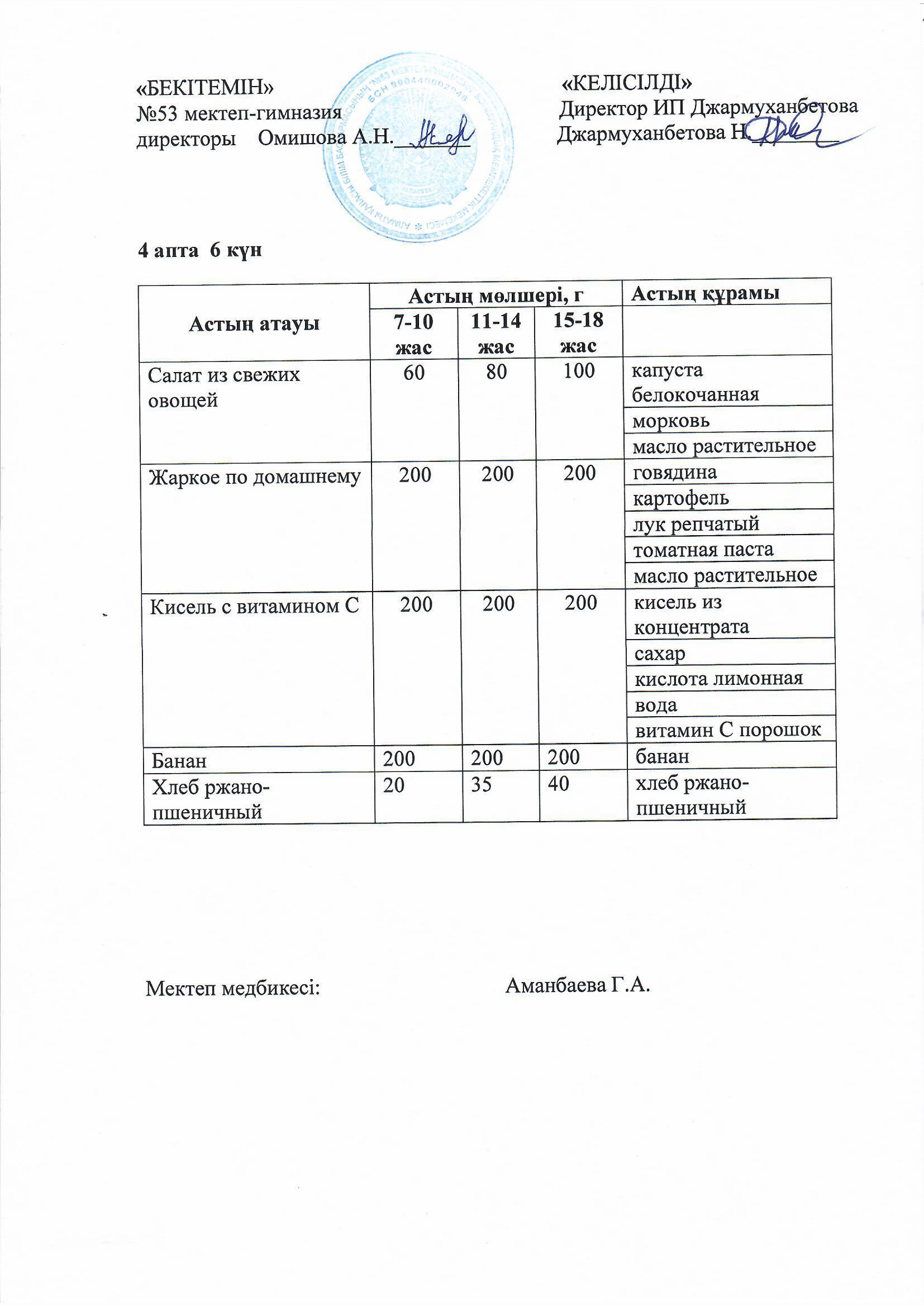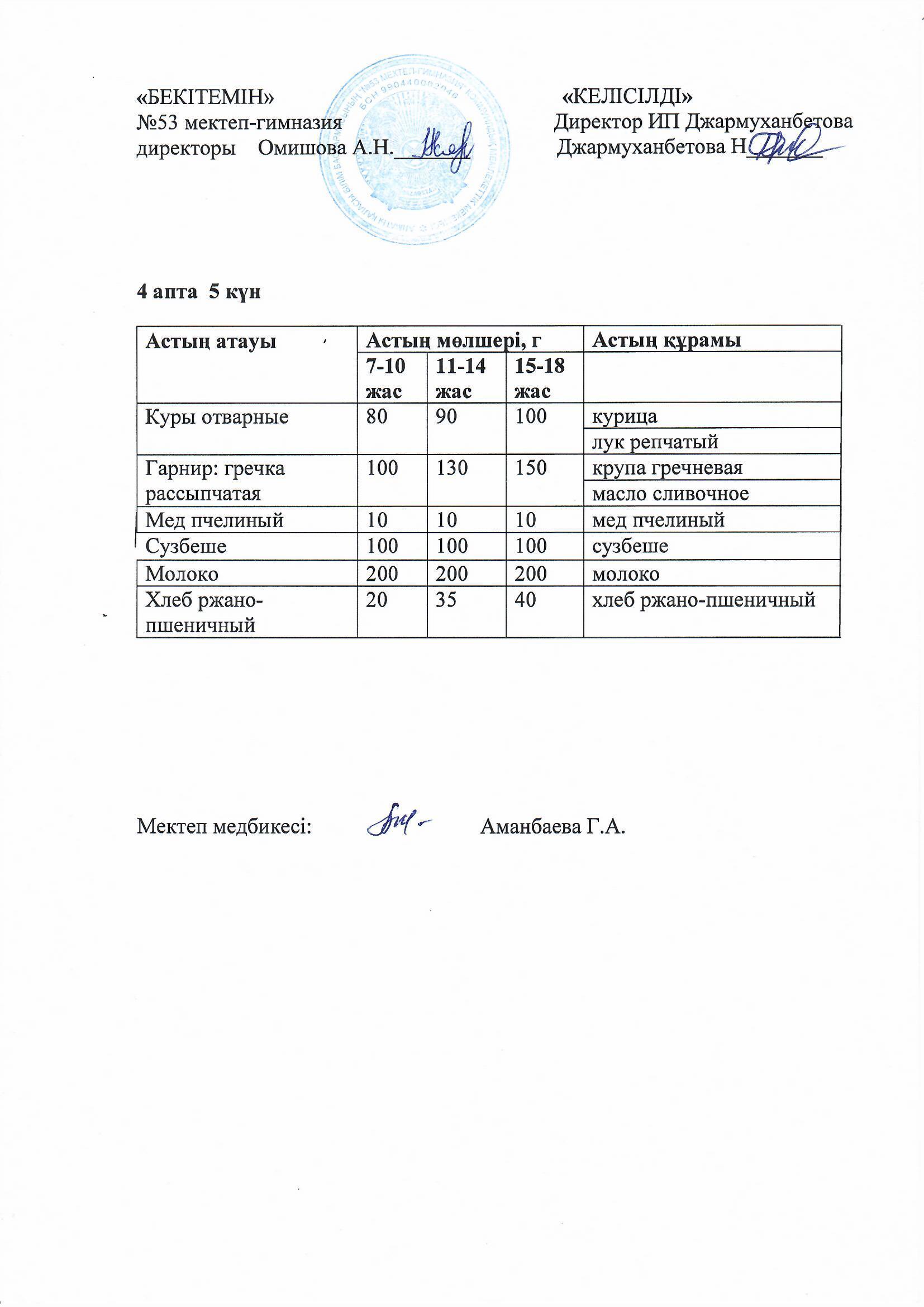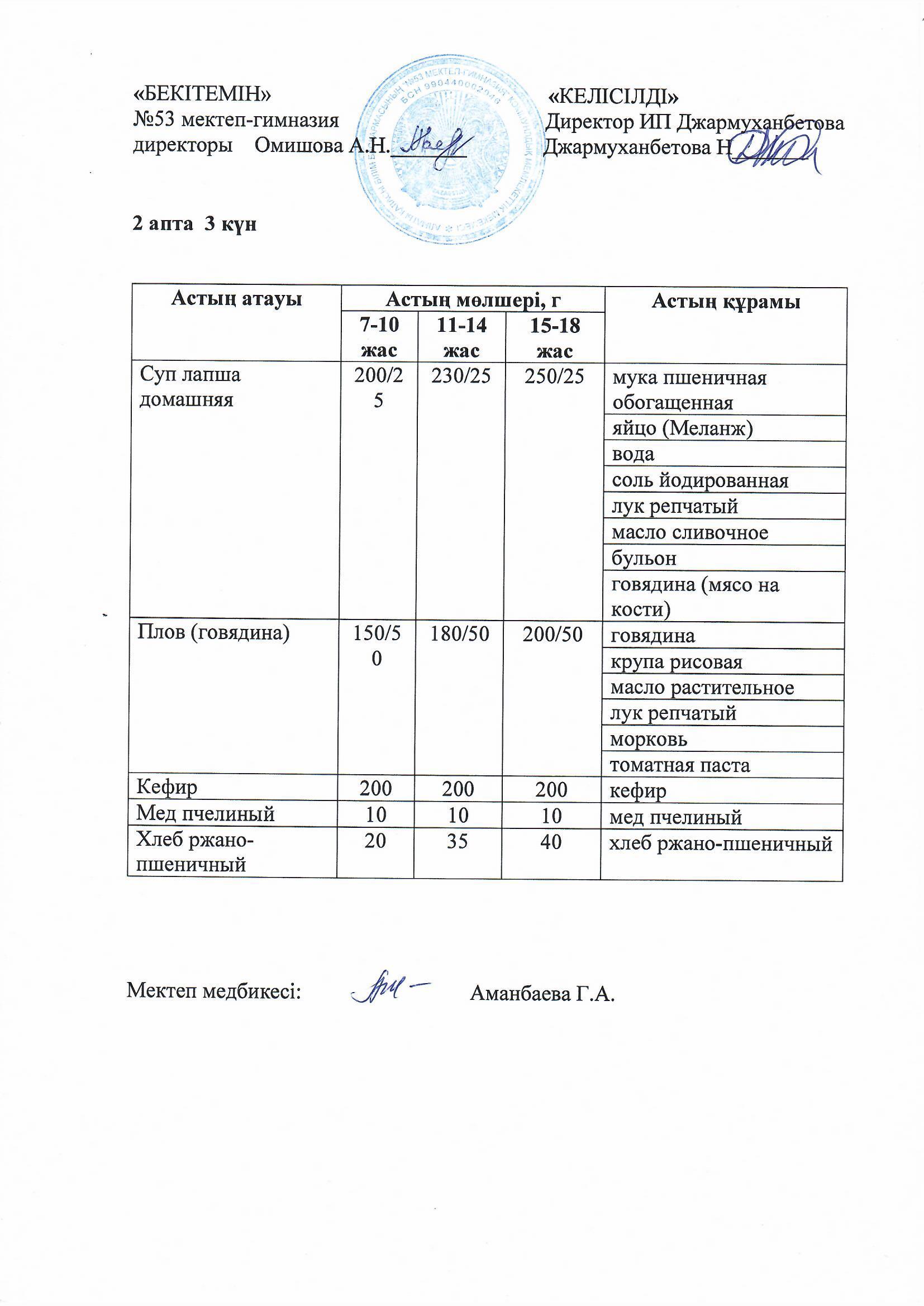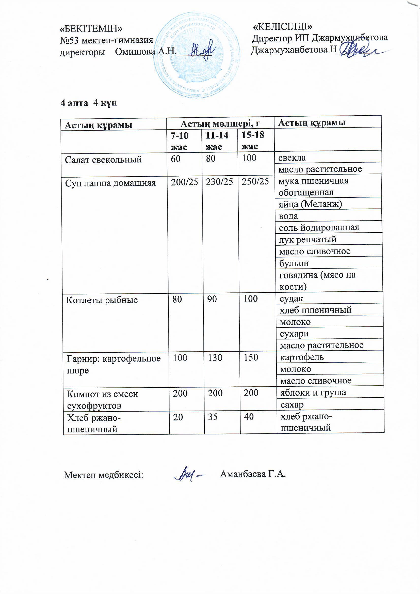 Білім басқармасы тарапынан бекітілген ас мәзірі