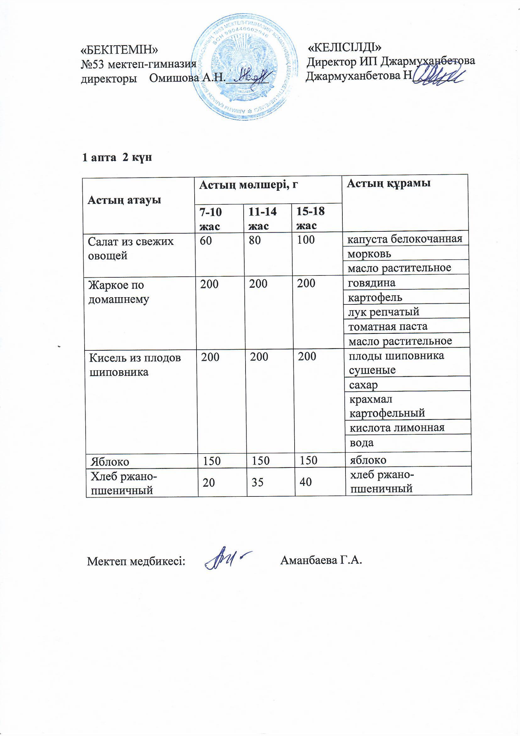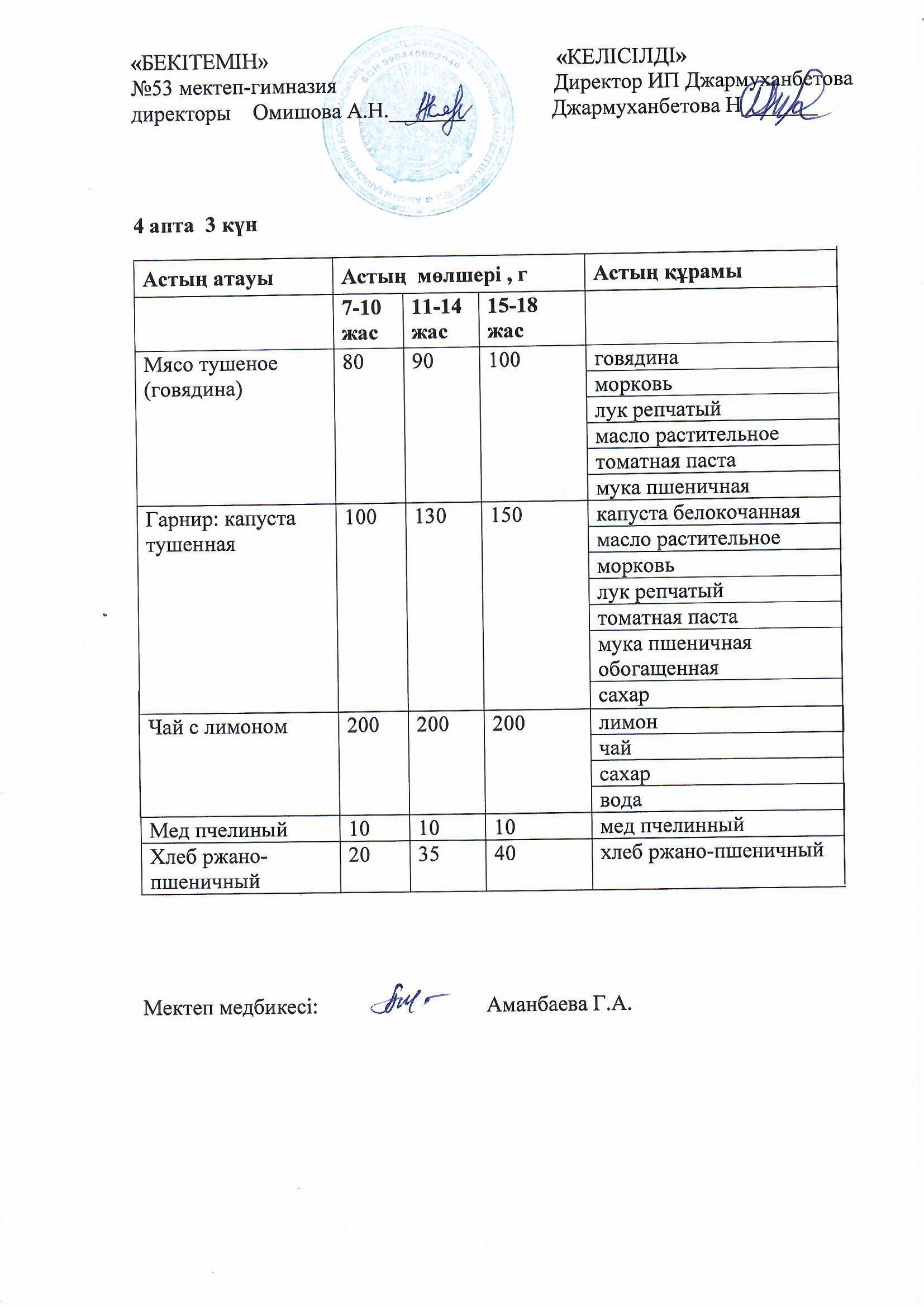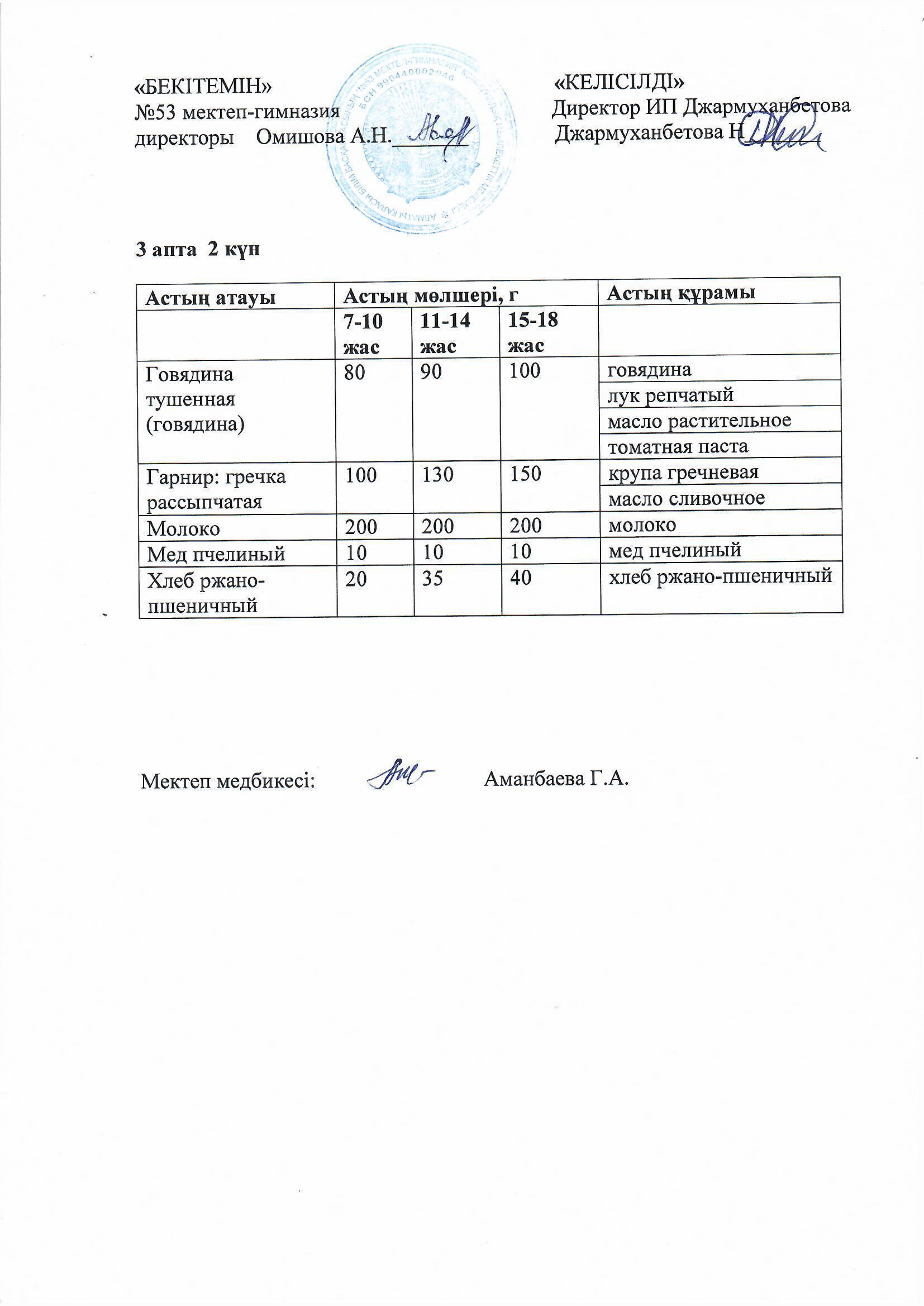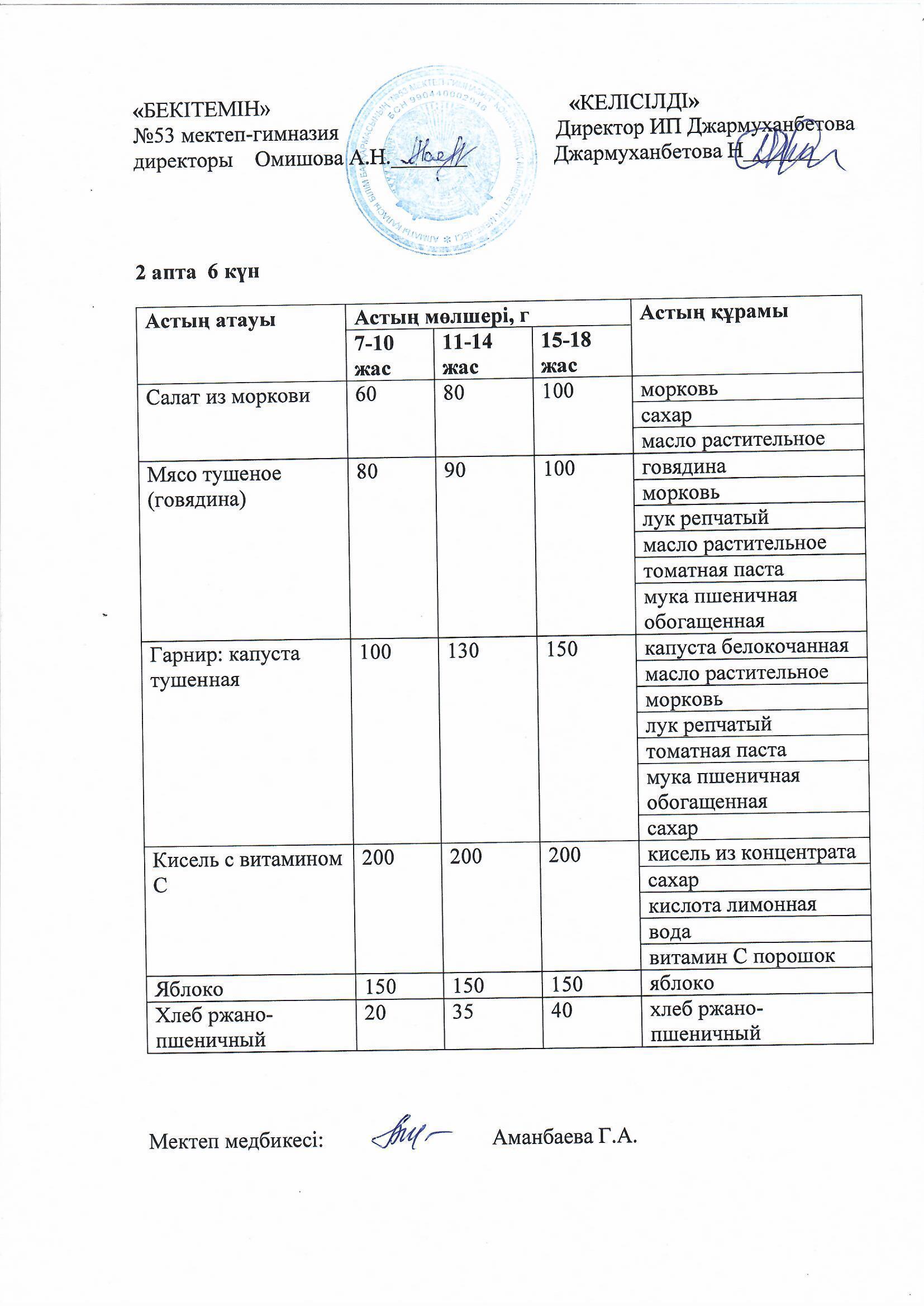 Білім басқармасы тарапынан бекітілген ас мәзірі