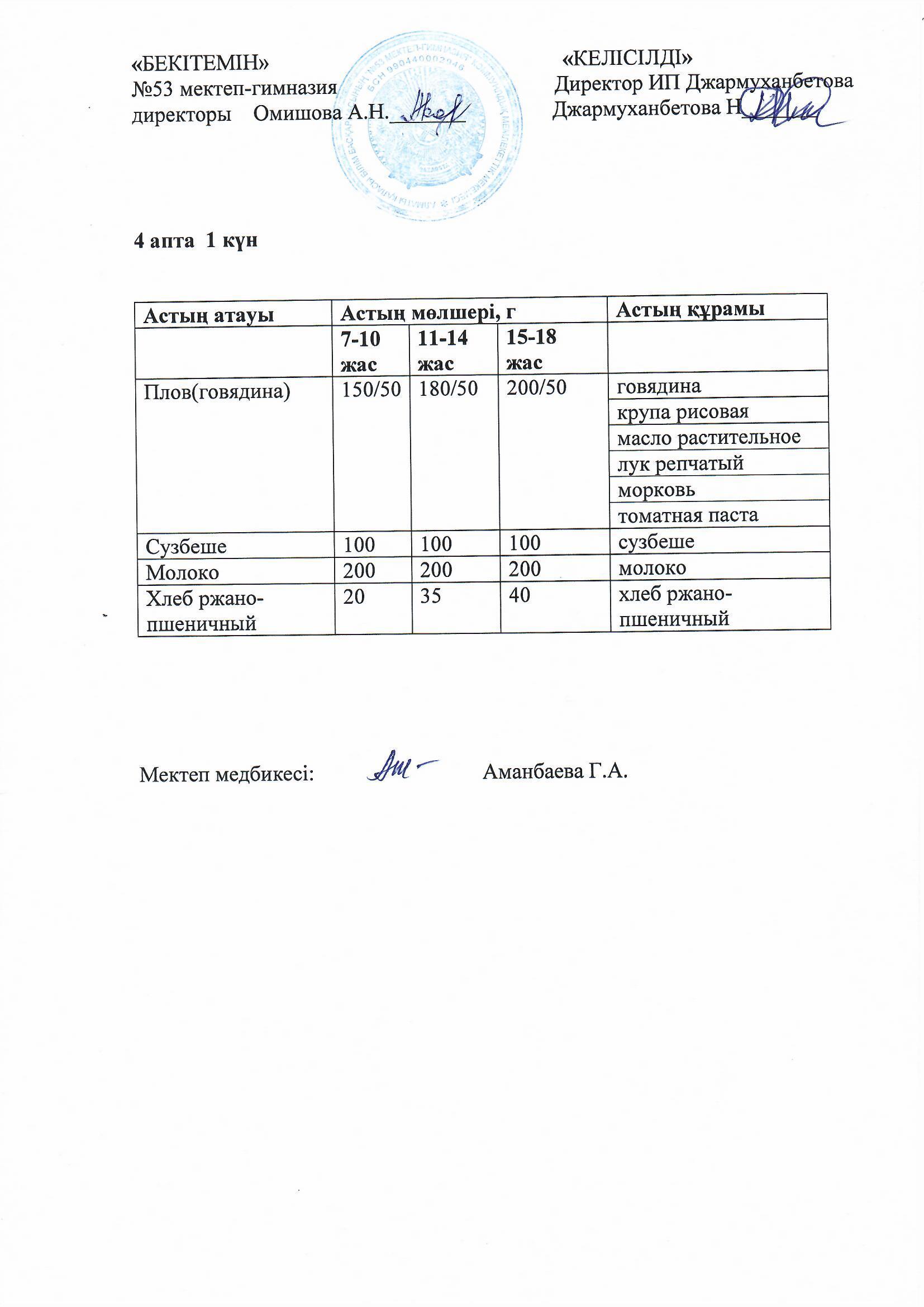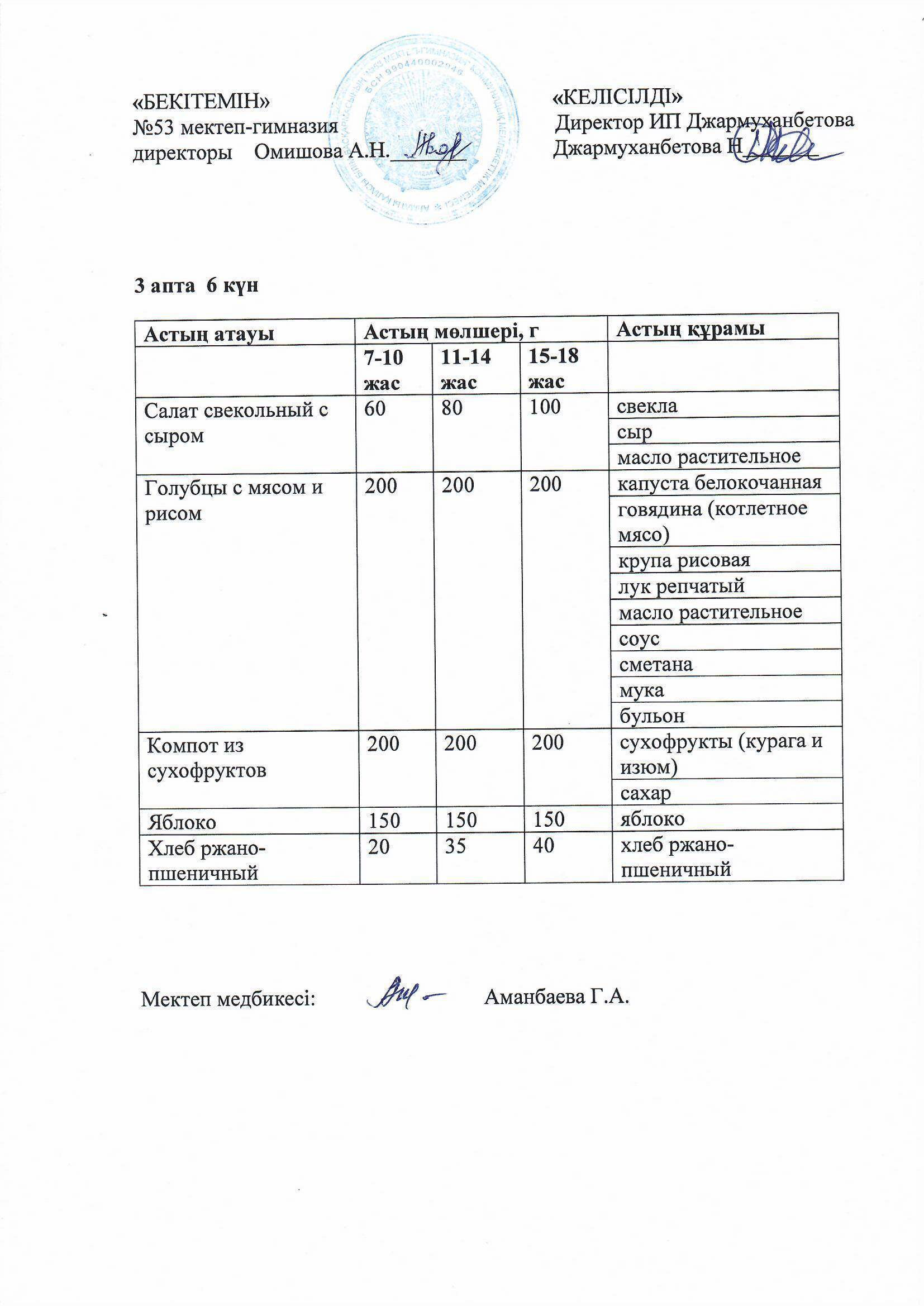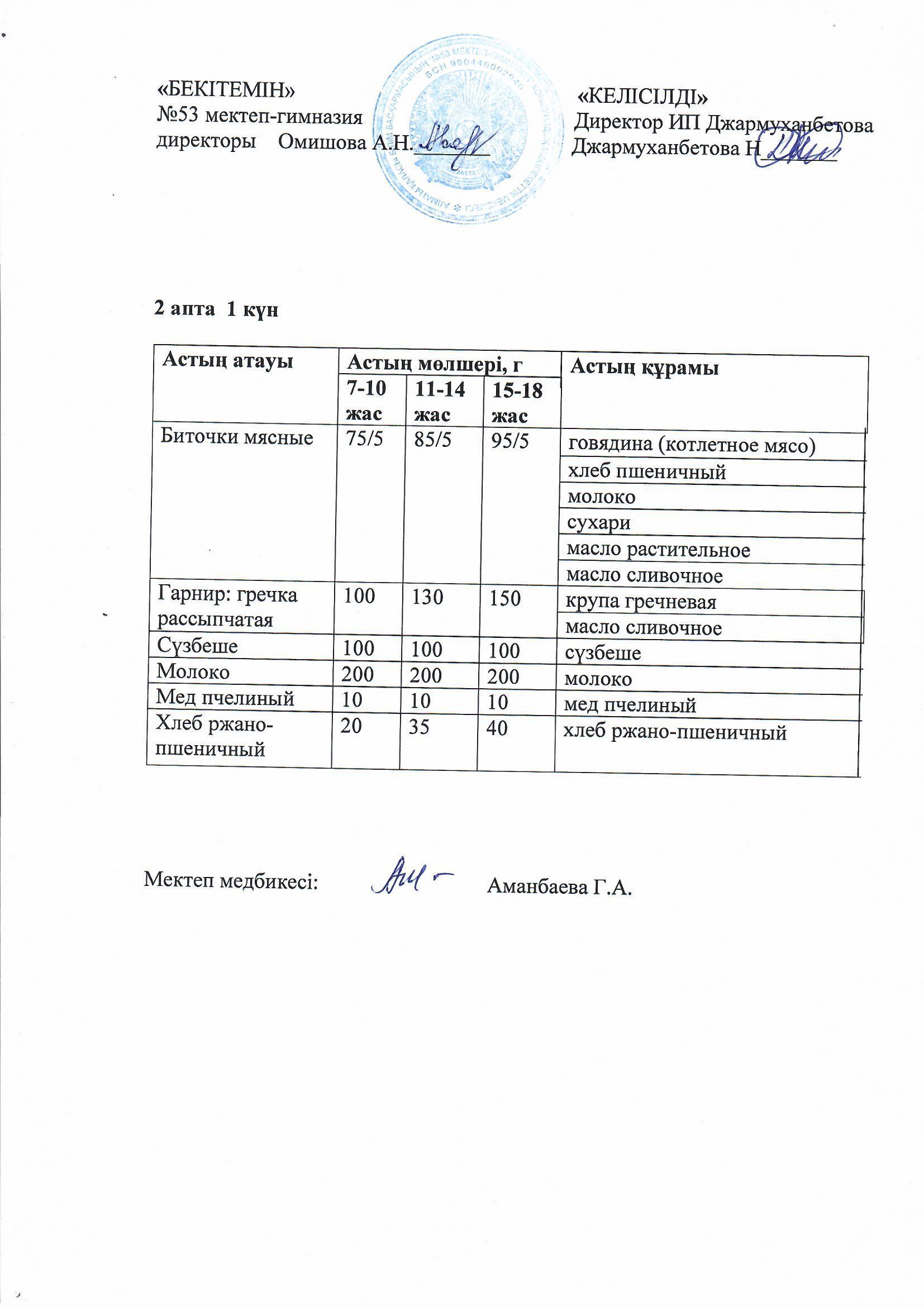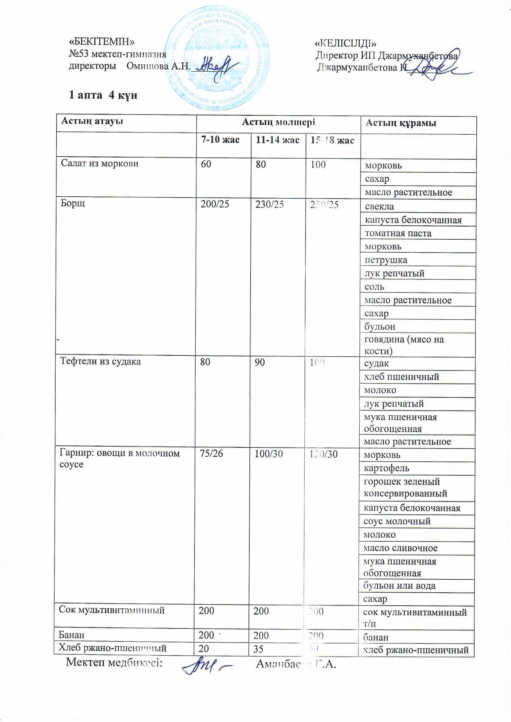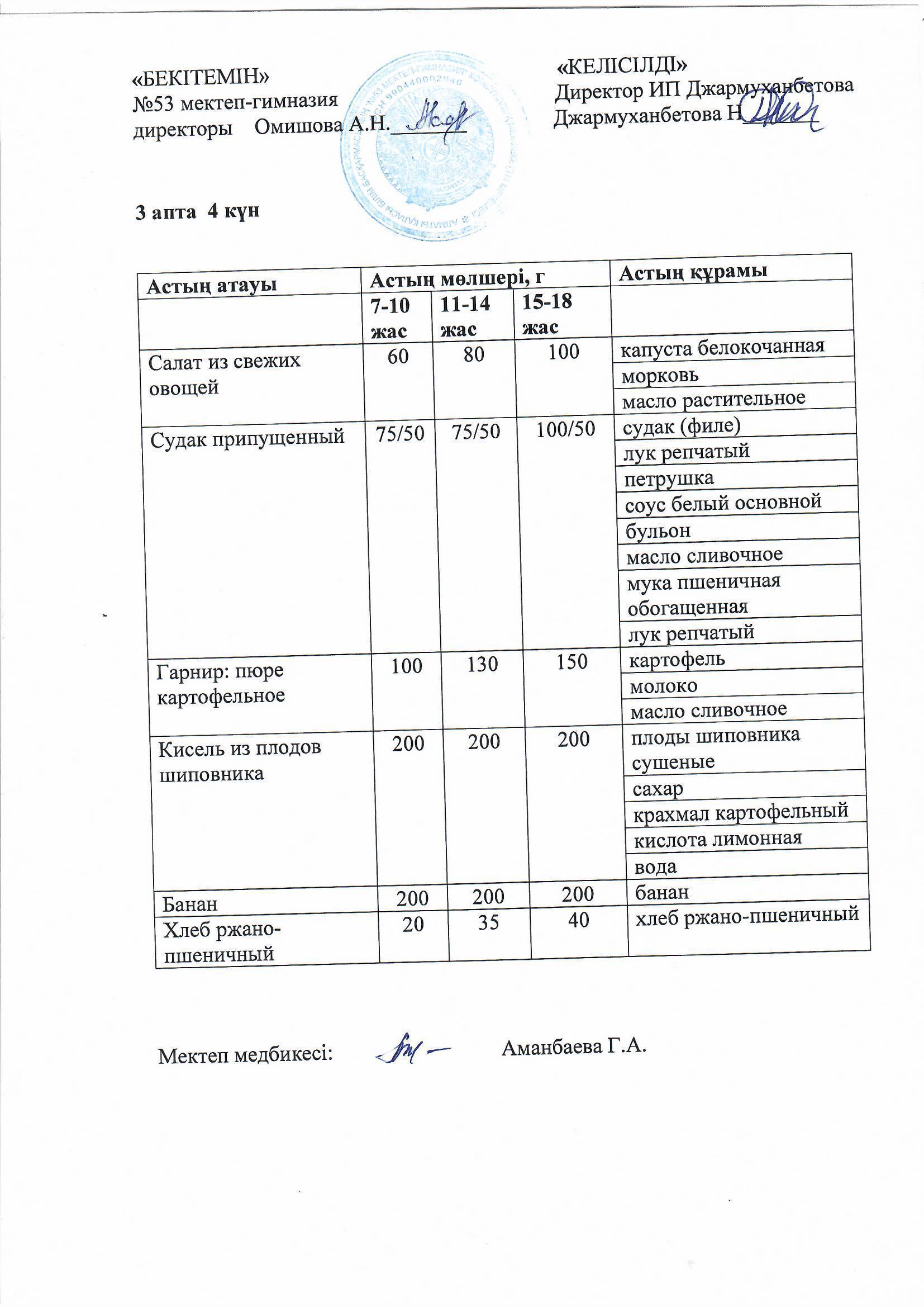 Білім басқармасы тарапынан бекітілген ас мәзірі