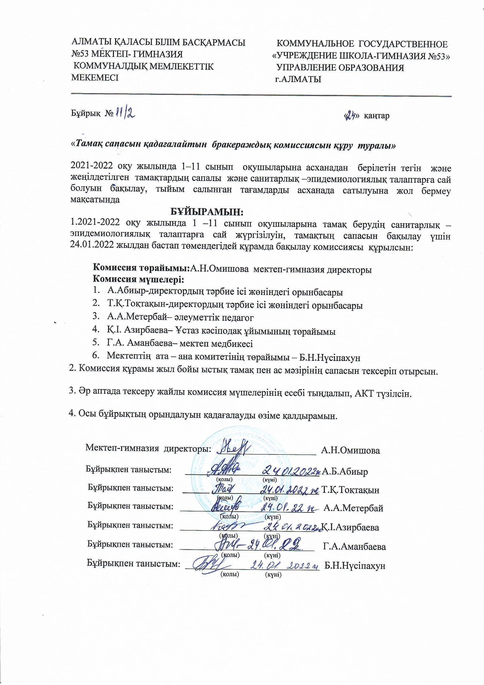 "Тамақ сапасын қадағалайтын бракераждық комиссиясын құру туралы бұйрық
