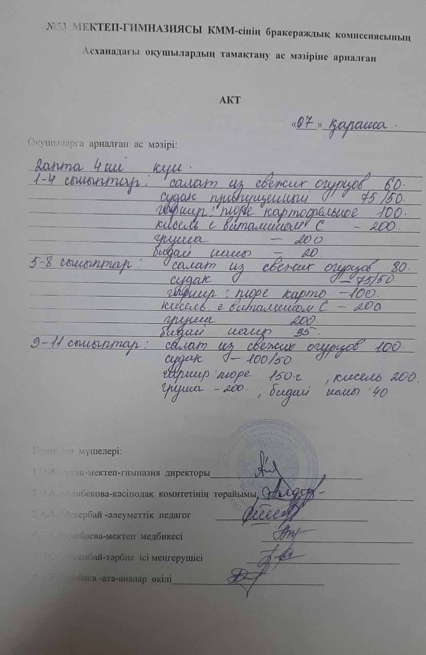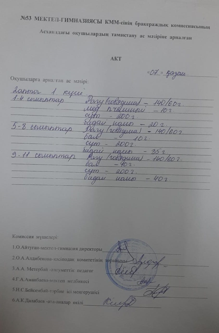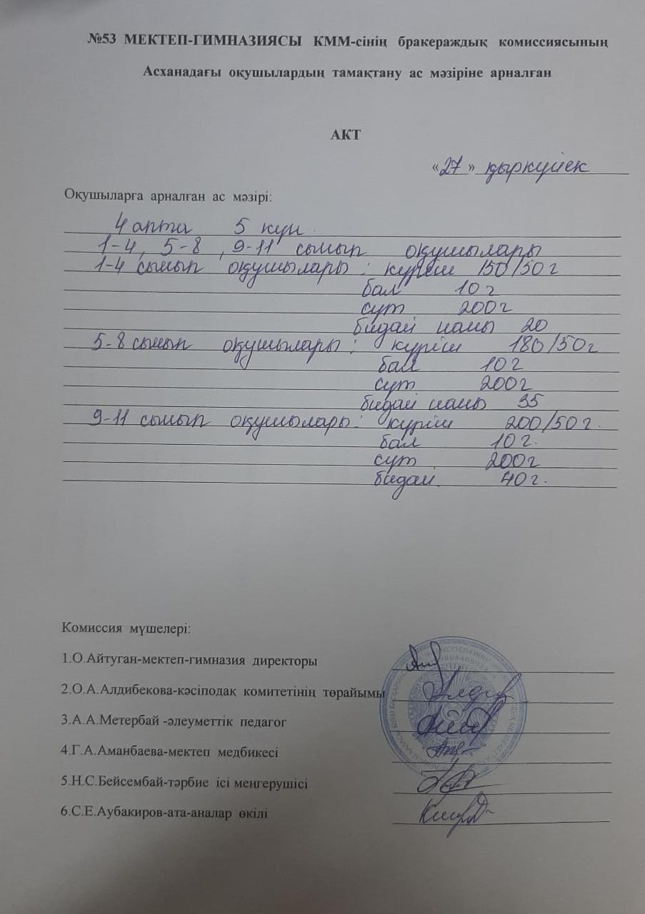 03 ноябрь 2020 0 1 2 3 4 5 Бракераждық комиссияның асханадағы оқушылардың тамақтану ас мәзіріне жүргізген АКТ "Жаз-күз" мезгілдеріне арналған ас мәзірі бойынша.