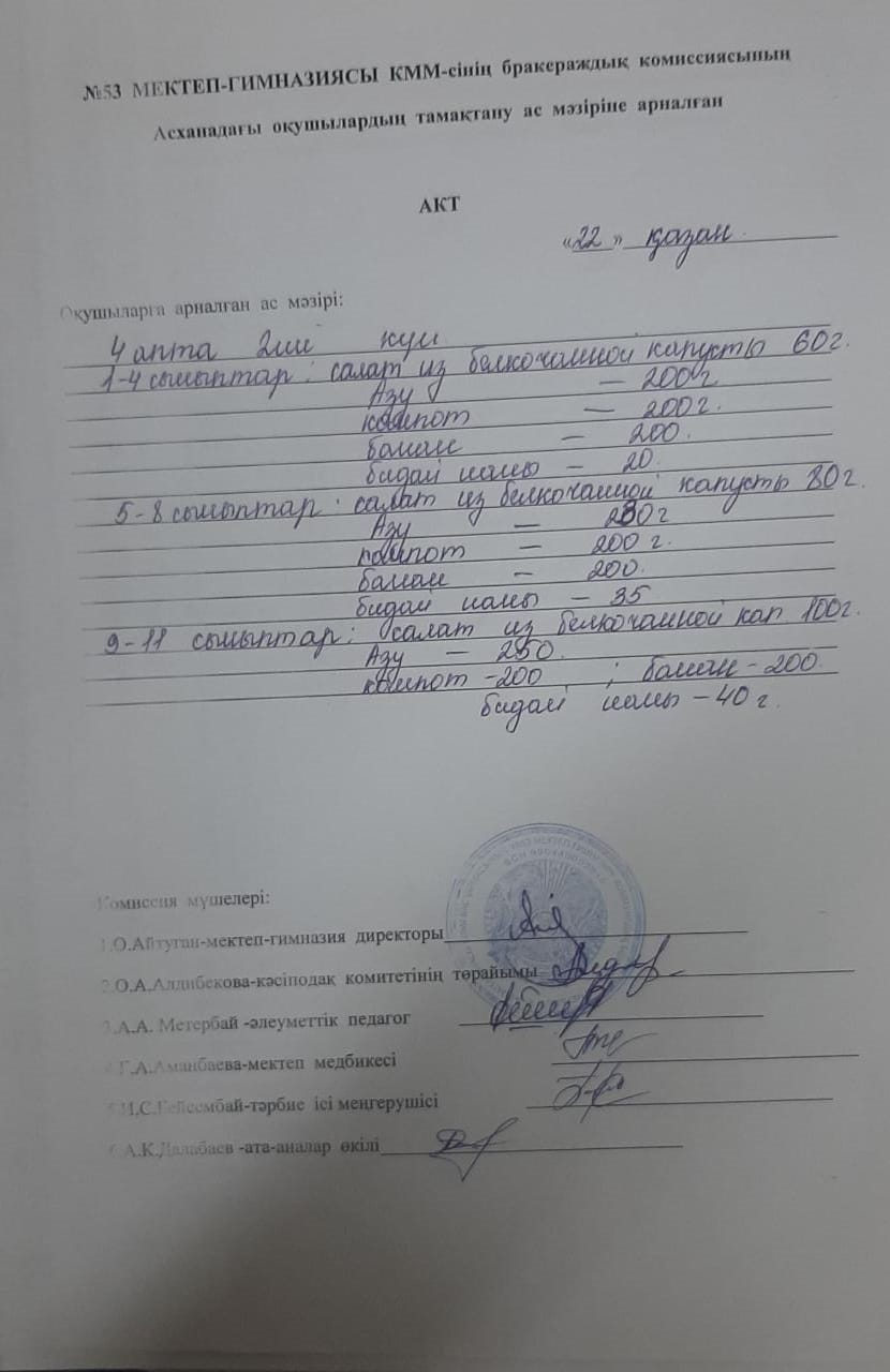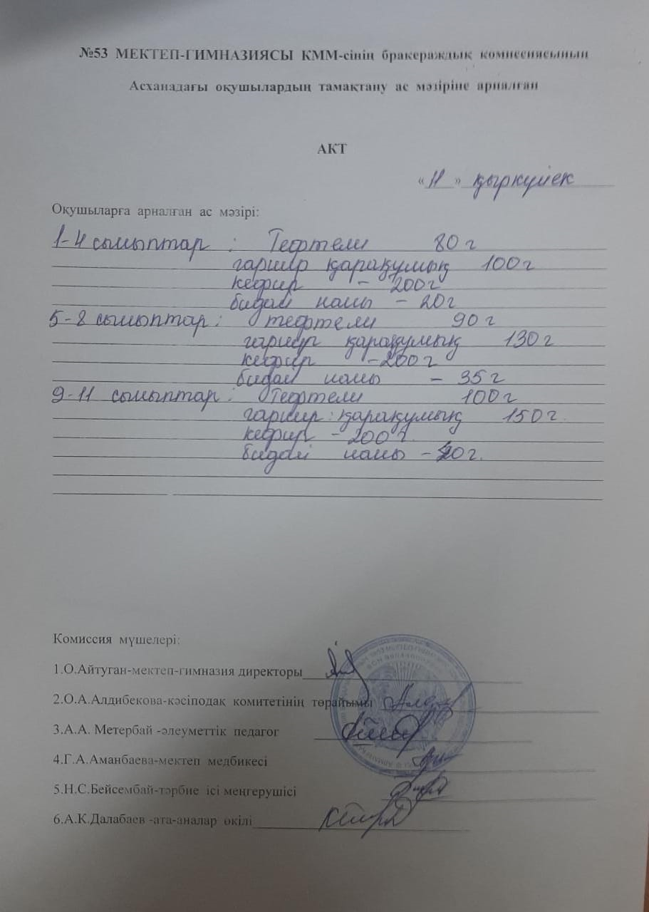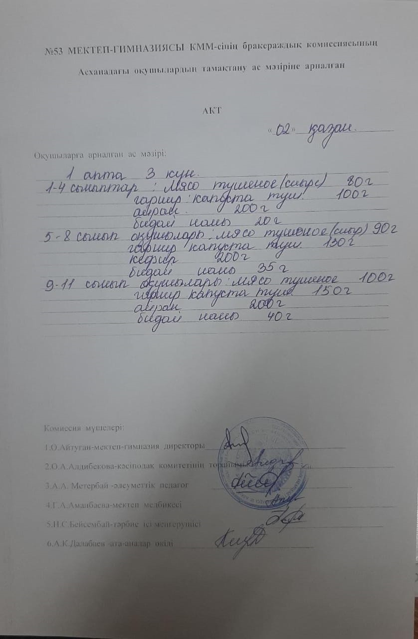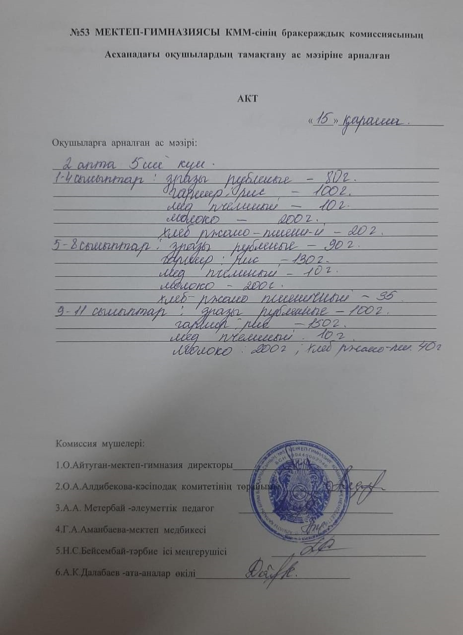 03 ноябрь 2020 0 1 2 3 4 5 Бракераждық комиссияның асханадағы оқушылардың тамақтану ас мәзіріне жүргізген АКТ "Жаз-күз" мезгілдеріне арналған ас мәзірі бойынша.