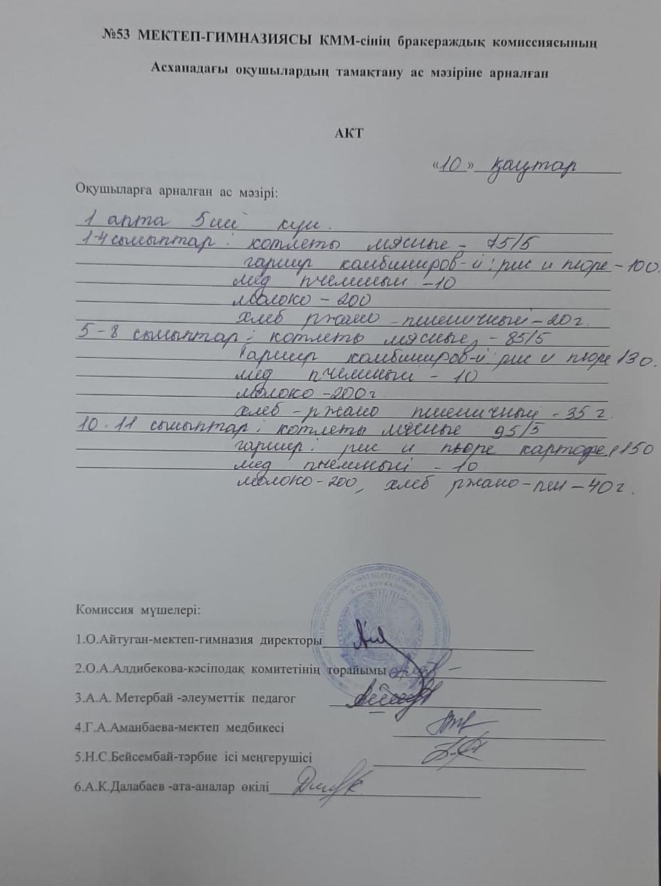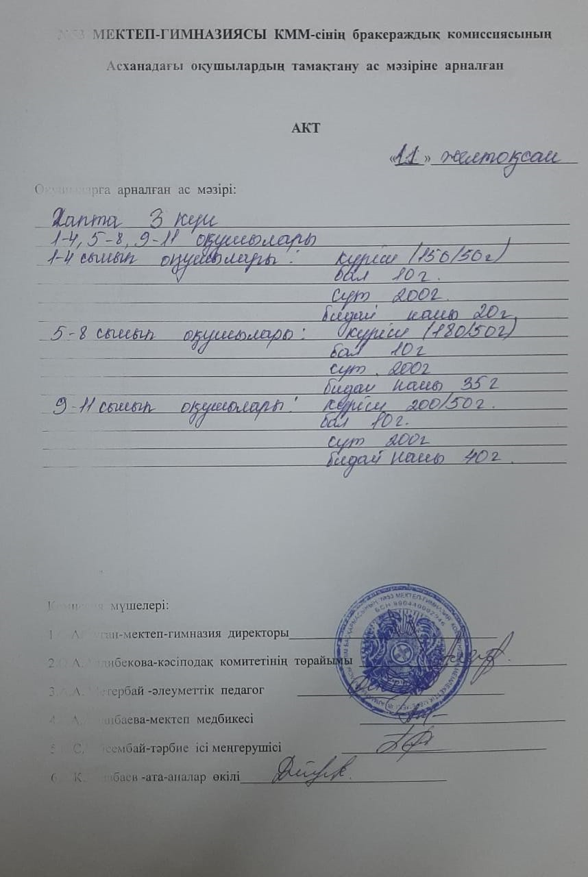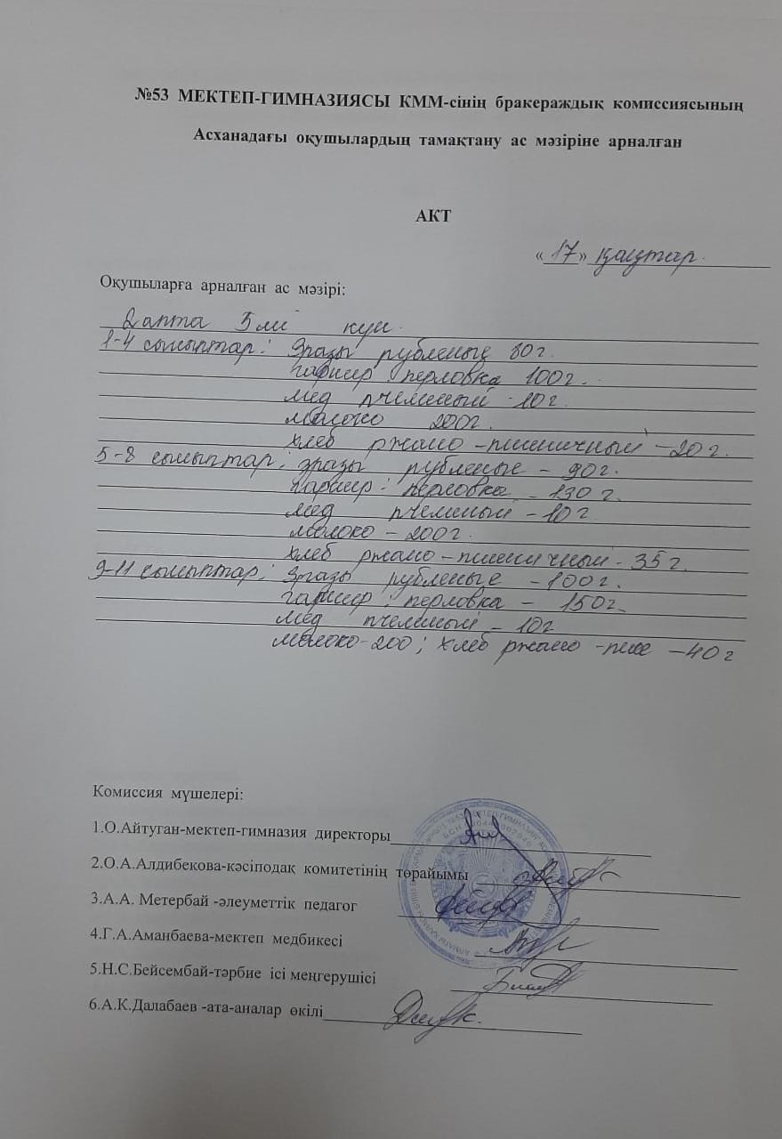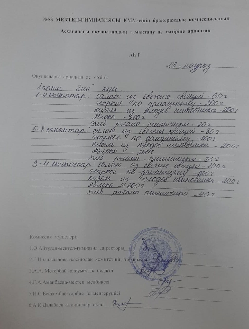 03 ноябрь 2020 0 1 2 3 4 5 Бракераждық комиссияның асханадағы оқушылардың тамақтану ас мәзіріне жүргізген АКТ "Қыс-көктем" мезгілдеріне арналған ас мәзірі бойынша.