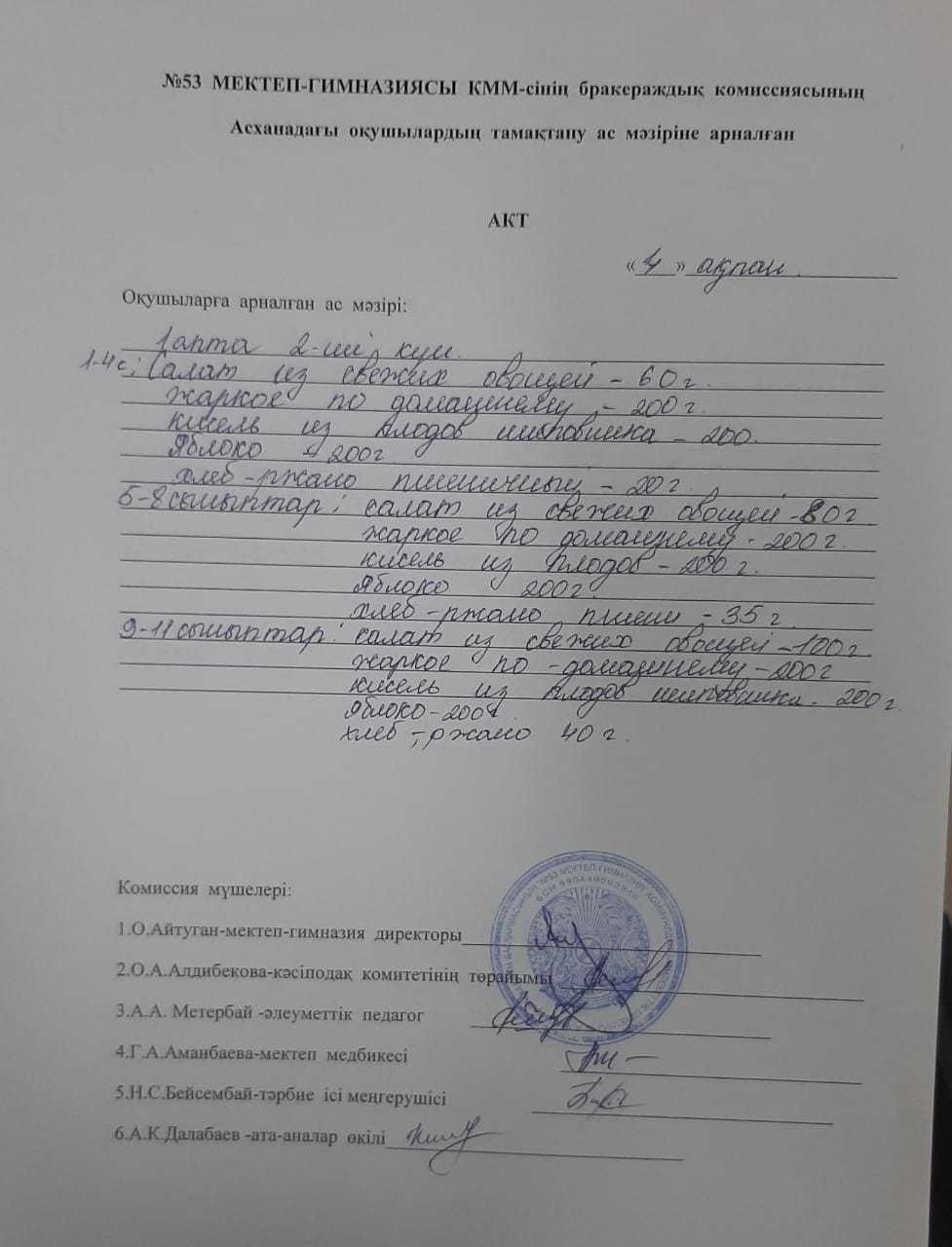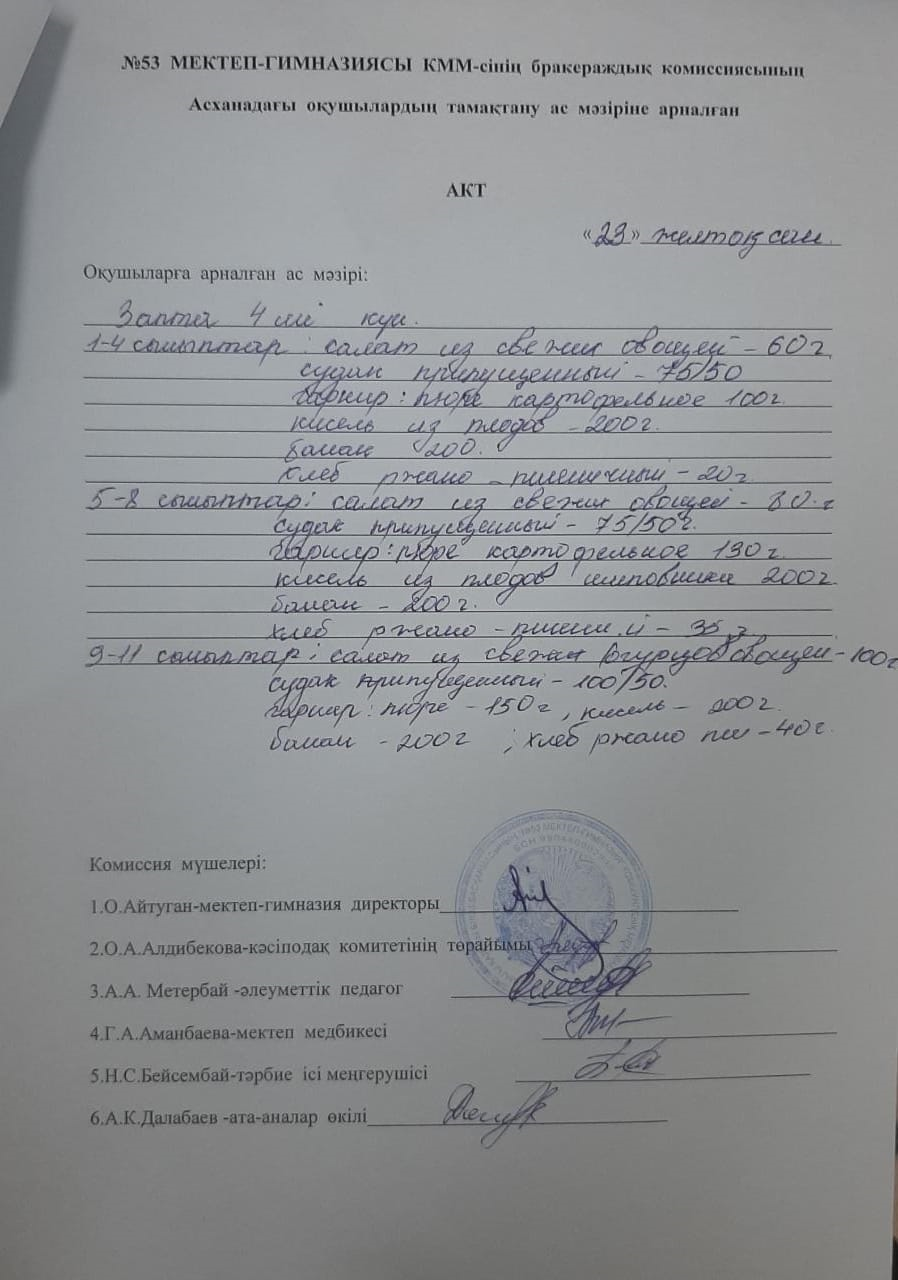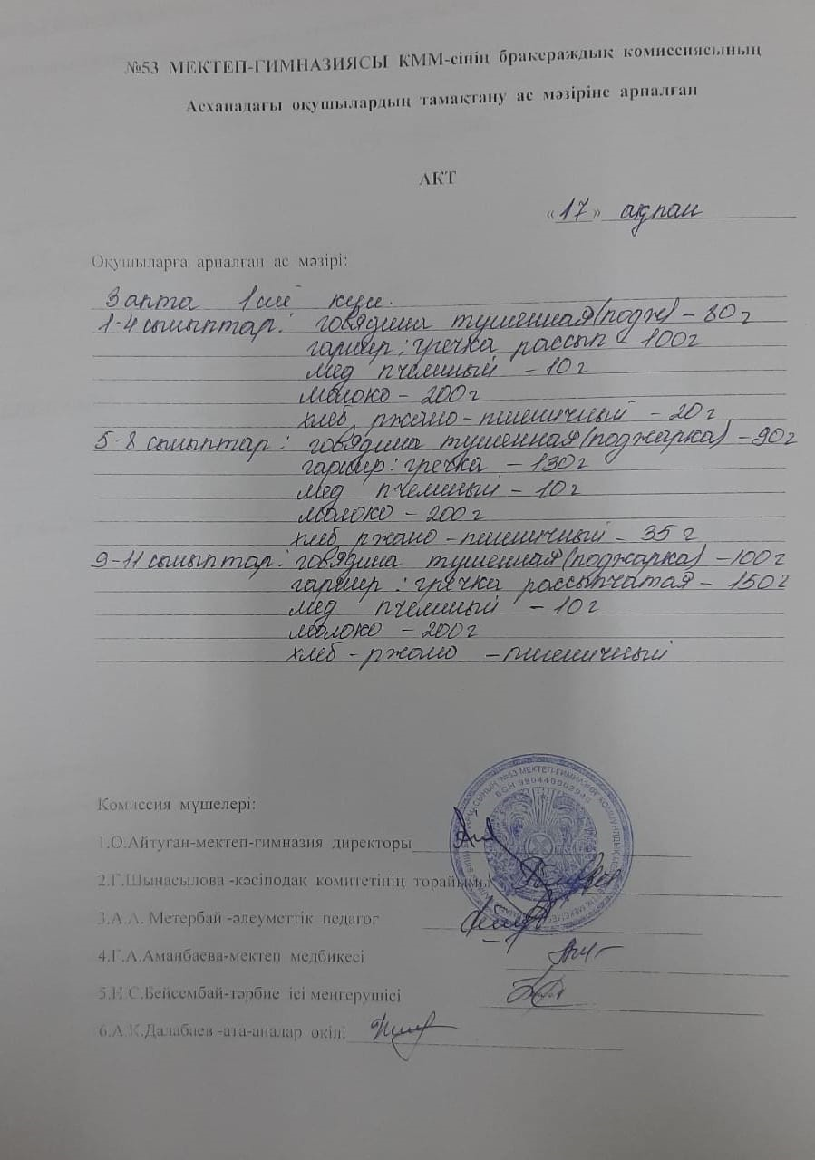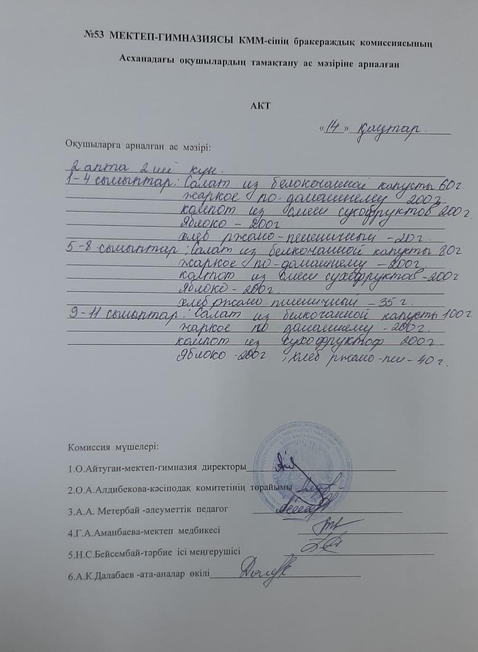 03 ноябрь 2020 0 1 2 3 4 5 Бракераждық комиссияның асханадағы оқушылардың тамақтану ас мәзіріне жүргізген АКТ "Қыс-көктем" мезгілдеріне арналған ас мәзірі бойынша.